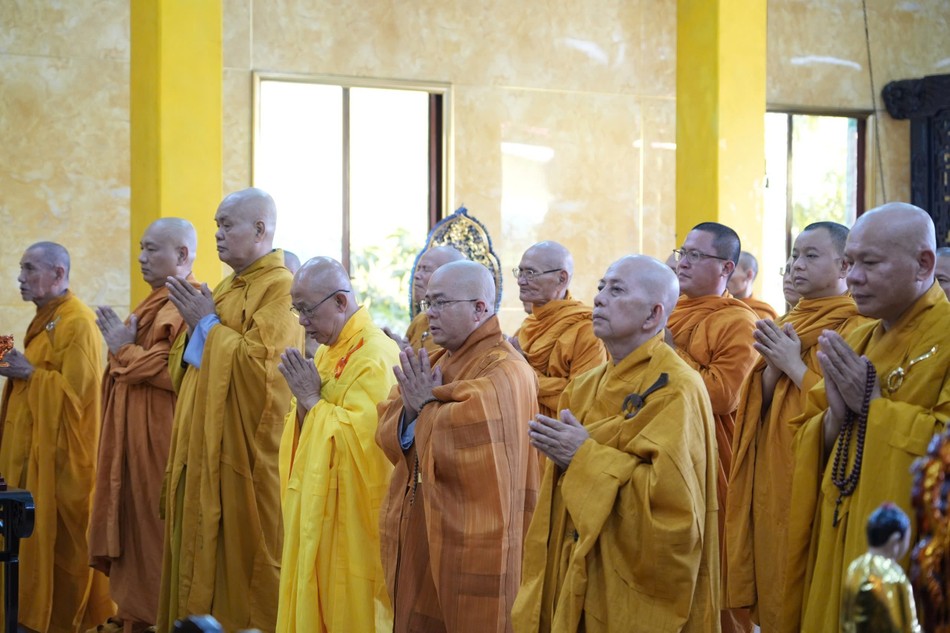 Tại chánh điện, chư tôn đức chứng minh đã niêm hương bạch Phật, đại chúng xưng tán hồng danh Đức Phật Bổn Sư Thích Ca Mâu Ni, đồng tụng thời kinh.