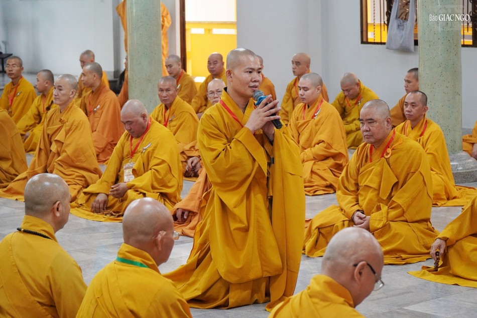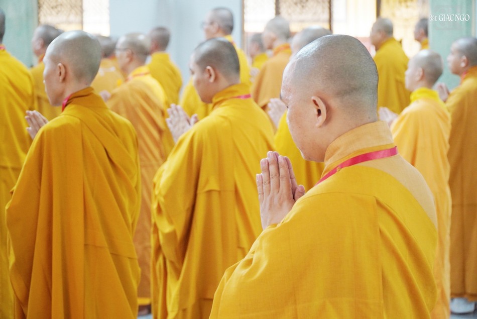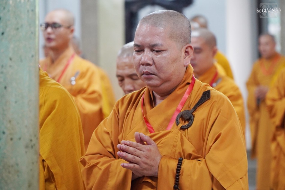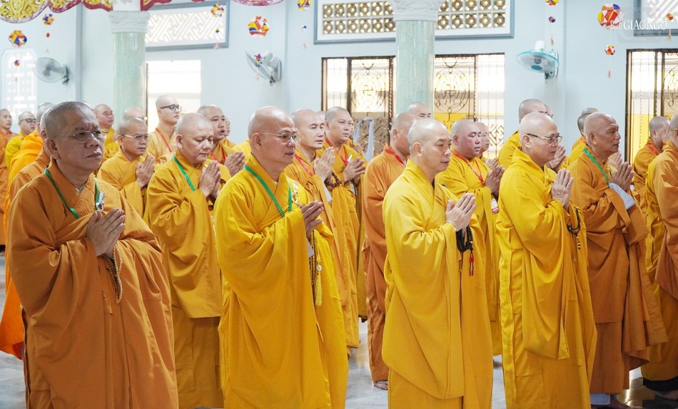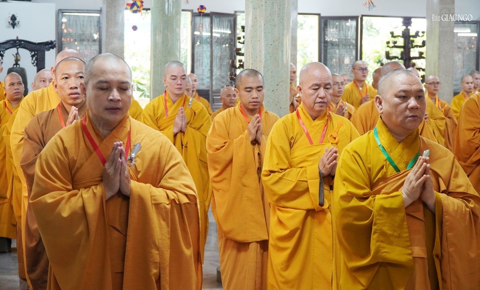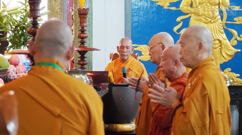 Sau sinh hoạt chung, chư Tăng đã vân tập chánh điện chùa Huỳnh Kim thực hiện nghi thức Bố-tát an cư theo truyền thống.