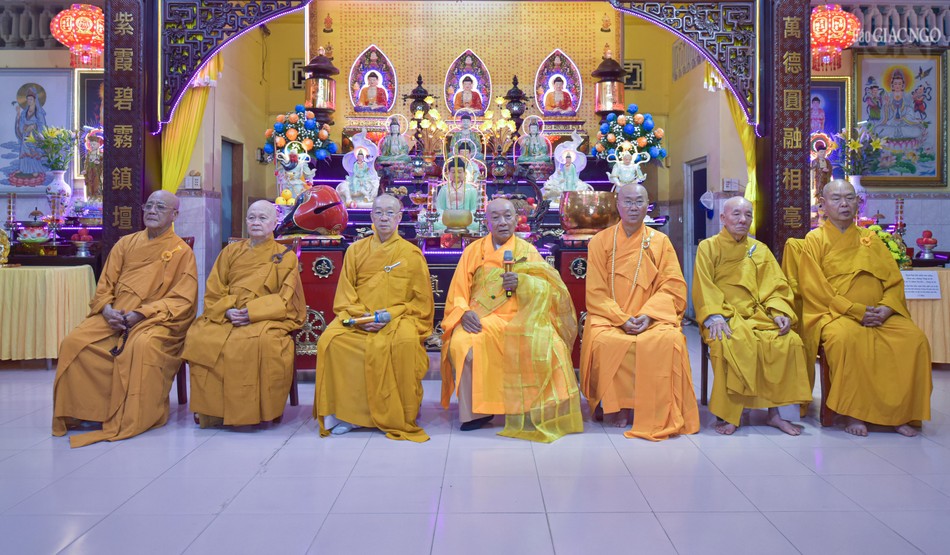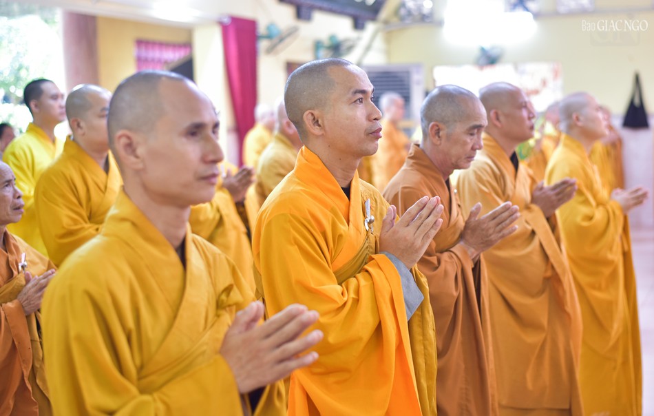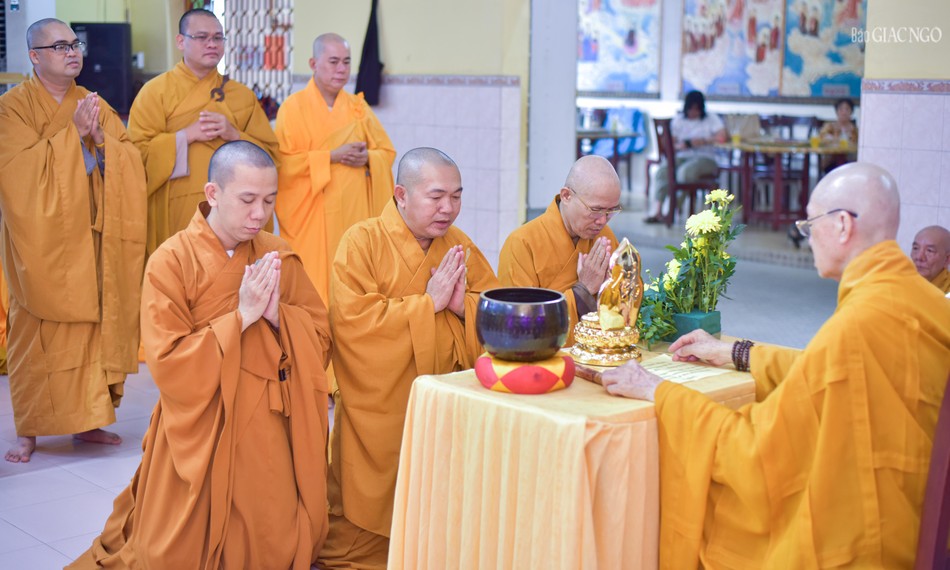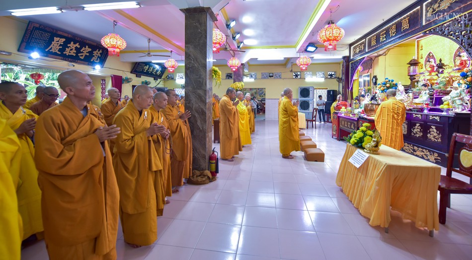 Tại chánh điện chùa Long Hoa, chư vị Hòa thượng hướng dẫn đại chúng niêm hương bạch Phật, thực hiện nghi thức tác pháp Tự tứ, cầu sự thỉnh lỗi sám hối để làm trong sạch thân tâm của mình sau 3 tháng an cư kiết hạ.