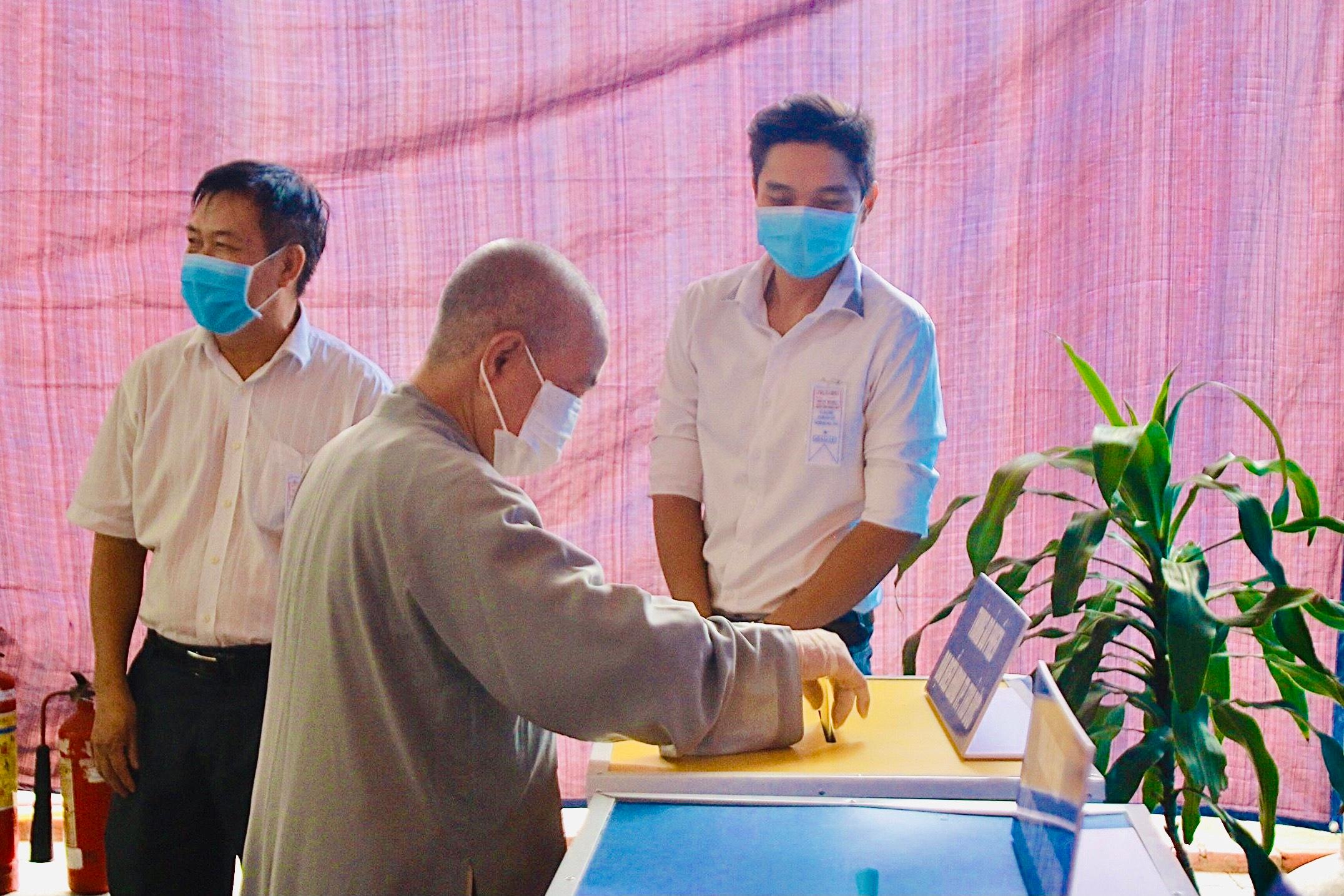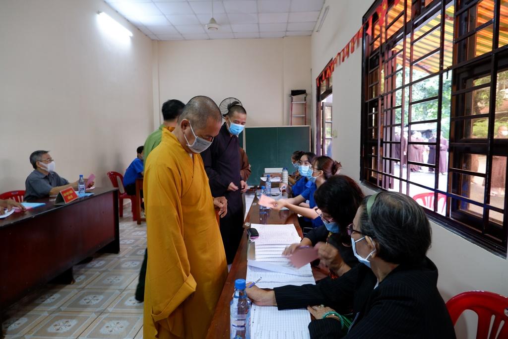 Theo đó, tại khu vực bỏ phiếu số 44 chùa Vĩnh Nghiêm (quận 3), Trưởng lão Hòa thượng Thích Đức Nghiệp, Phó Pháp chủ Hội đồng Chứng minh GHPGVN, cử tri lớn tuổi nhất khu vực bầu cử, được bỏ phiếu đầu tiên, sau đó lần lượt chư tôn đức thực hiện nhiệm vụ cử tri của mình.