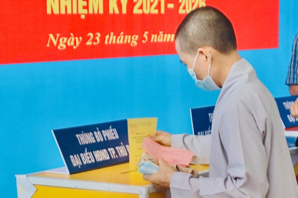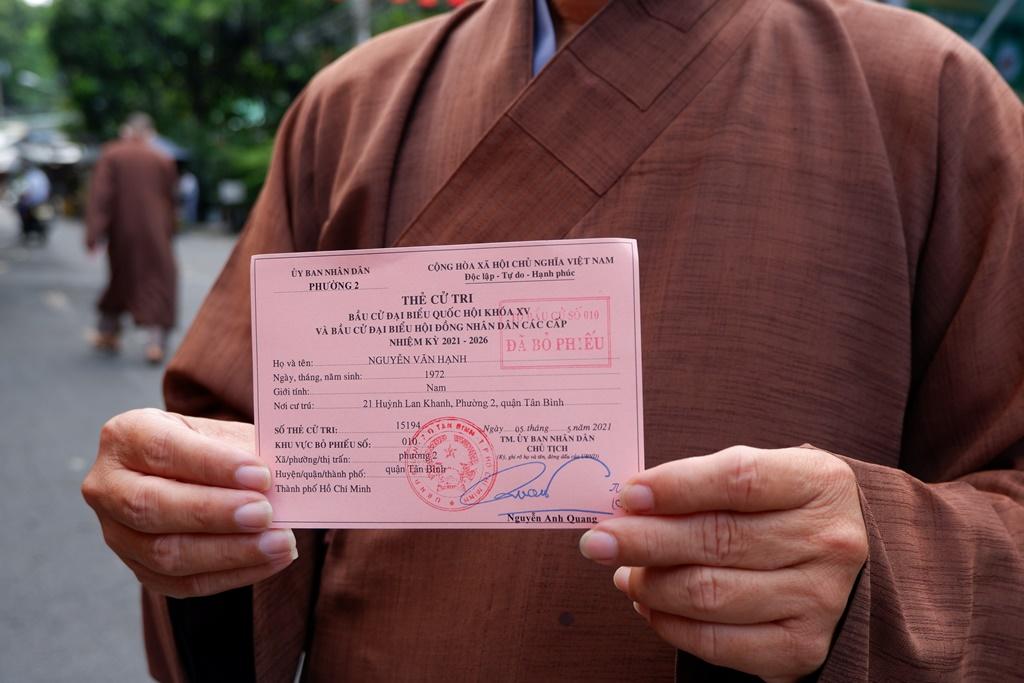 Tại điểm bầu cử số 47 (phường 9, quận 3, TP.HCM), Hòa thượng Thích Thiện Nhơn, Chủ tịch Hội đồng Trị sự GHPGVN cùng chư Tăng chùa Minh Đạo đã đến thực hiện các thủ tục bỏ phiếu theo quy định.