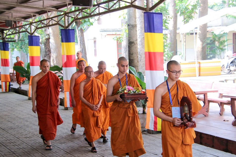 Chư giới tử được sự hướng dẫn của chư tôn đức Ban Điều hành đã cử hành nghi thức cung nghinh và cầu thỉnh chư vị giáo phẩm ban bố pháp âm.