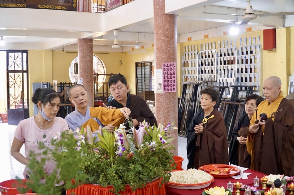 Cũng trong sáng nay, Phật tử và người dân, cộng đồng người Hoa trên địa bàn quận đã đến chùa Liên Hoa tham gia Lễ Tắm Phật, phát tâm cúng dường và đóng góp vào Quỹ "Không vàng mã" của chùa, chuẩn bị cho các chương trình chia sẻ yêu thương, tiếp sức học sinh đến trường trong năm học mới.