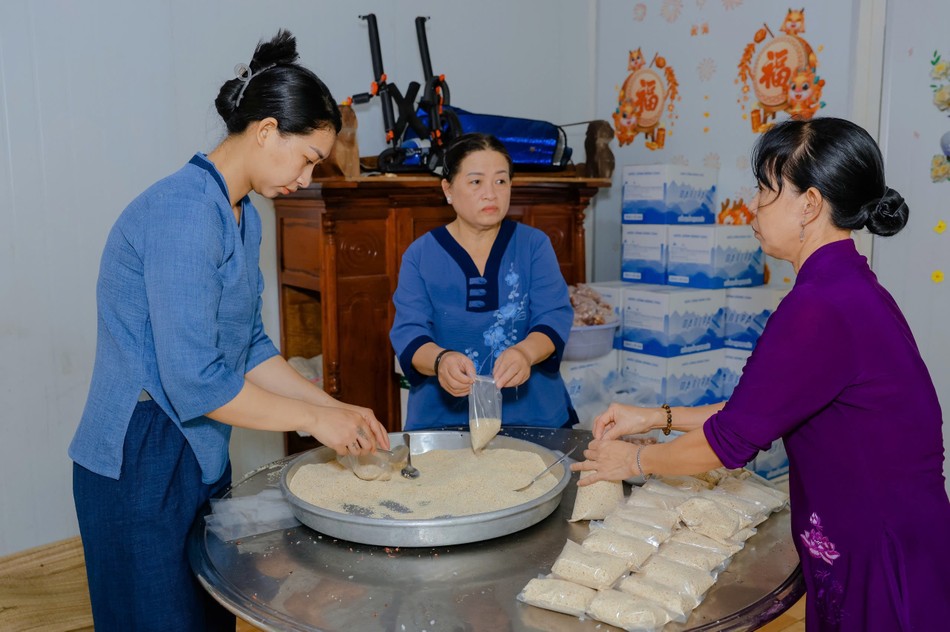 Đặc biệt, trong đợt này, chùa chuẩn bị hơn 500 phần cơm được hút chân không kèm theo trứng luộc, muối mè, muối đậu phộng, muối sả. Đây là những phần thực phẩm bà con vùng lũ có thể sử dụng ngay khi nhận được và có thể bảo quản được lâu dài.