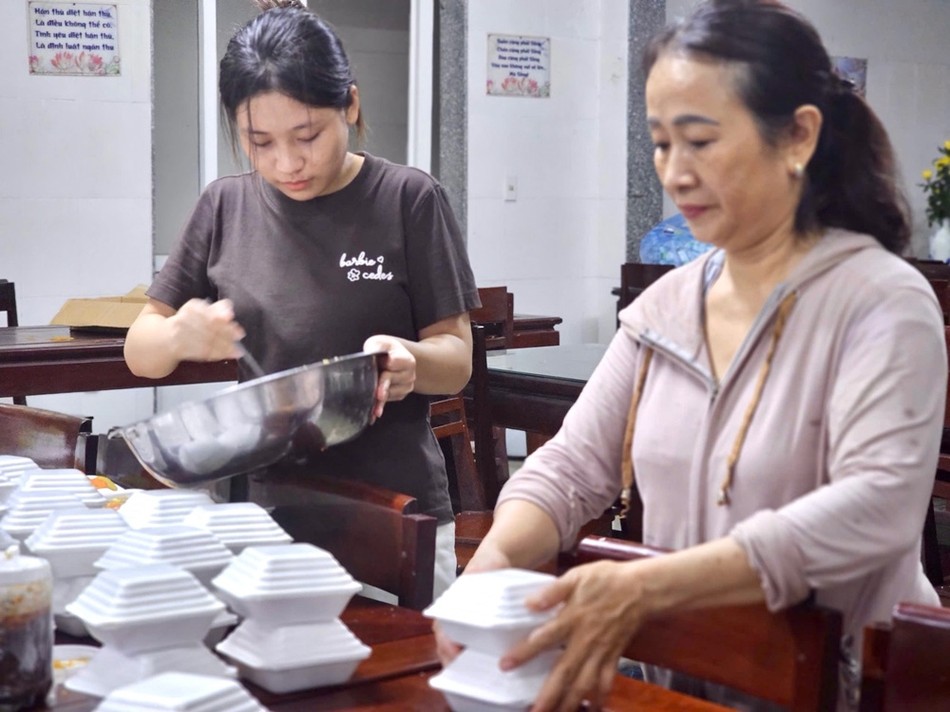 Các Phật tử soạn những phần thức ăn chuẩn bị chuyển đến bà con vùng bị cô lập |