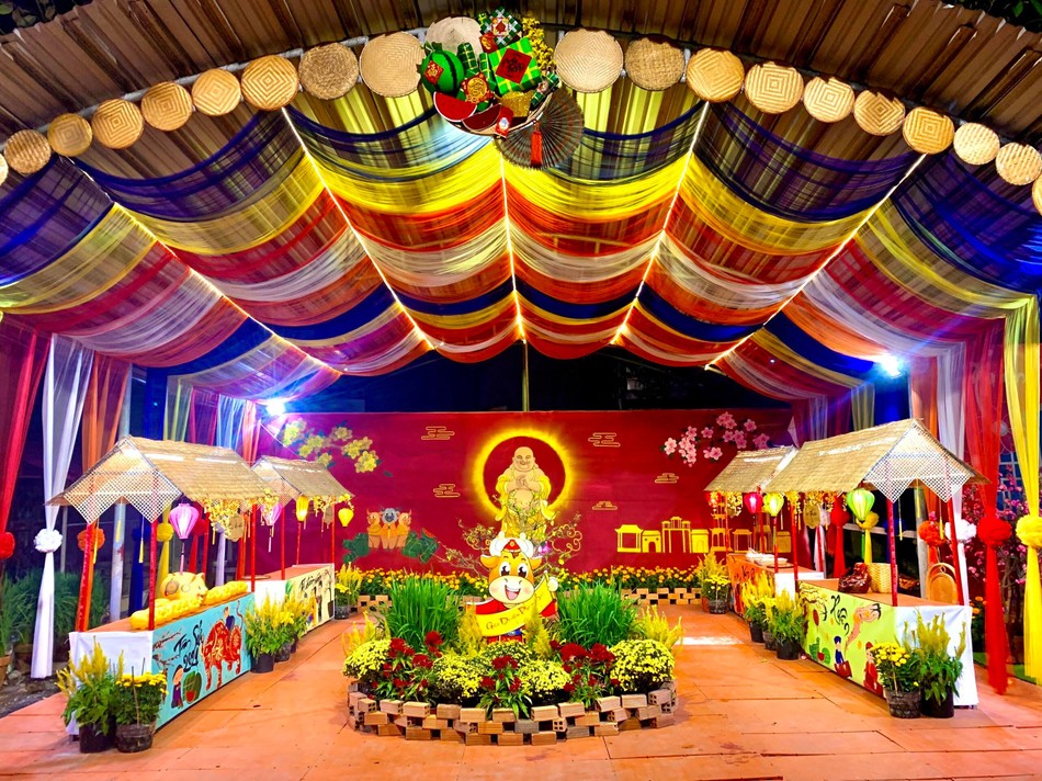 Để hoàn thành các công trình đón Xuân, vui Tết kịp thời, chư Tăng và Phật tử đã tích cực trong khâu trang trí. Những ngày cận Tết, nhiều đêm làm việc đến 1 - 2 giờ sáng. Nguyên liệu để làm nên những mô hình đón Tết chủ yếu là những chất liệu quen thuộc, thân thiện với môi trường.