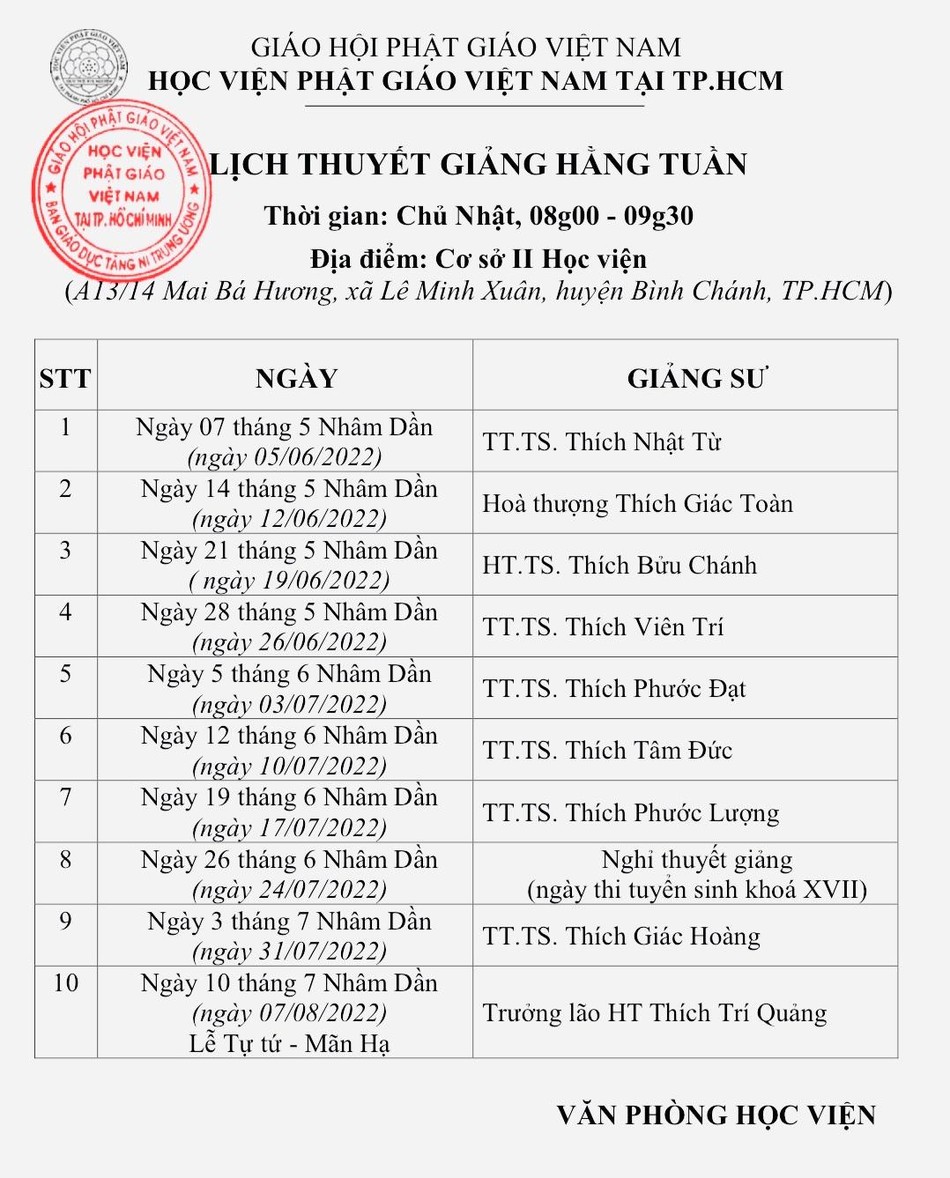 Theo đó, chư tôn đức Hội đồng Điều hành sẽ luân phiên thuyết giảng tại cơ sở II của Học viện (A13/14 Mai Bá Hương, xã Lê Minh Xuân, huyện Bình Chánh, TP.HCM), theo lịch cụ thể vừa được cập nhật như sau: