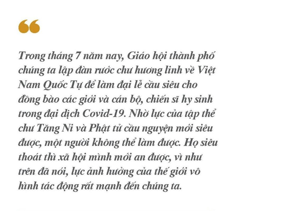Trong tháng 7 năm nay, Giáo hội thành phố chúng ta lập đàn rước chư hương linh về Việt Nam Quốc Tự để làm đại lễ cầu siêu cho đồng bào các giới và cán bộ, chiến sĩ hy sinh trong đại dịch Covid-19. Nhờ lực của tập thể chư Tăng Ni và Phật tử cầu nguyện mới siêu được, một người không thể làm được. Họ siêu thoát thì xã hội mình mới an được, vì như trên đã nói, lực ảnh hưởng của thế giới vô hình tác động rất mạnh đến chúng ta.