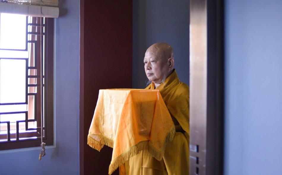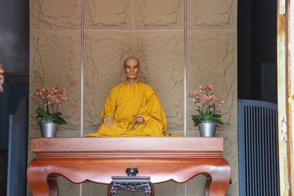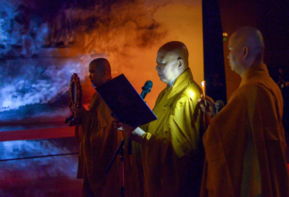 Đức Pháp chủ cùng chư vị Trưởng lão, giáo phẩm mật niệm pháp thân bất diệt của Bồ-tát Thích Quảng Đức trước khi cung thỉnh xá-lợi Trái tim của Ngài an vị nơi tháp Đa Bảo |