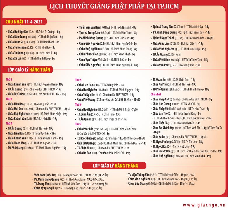 GN - Lịch thuyết giảng hàng tuần do Ban Hoằng pháp GHPGVN TP.HCM cung cấp, với thời gian, địa điểm và giảng sư tại các đạo tràng trên địa bàn TP.HCM.