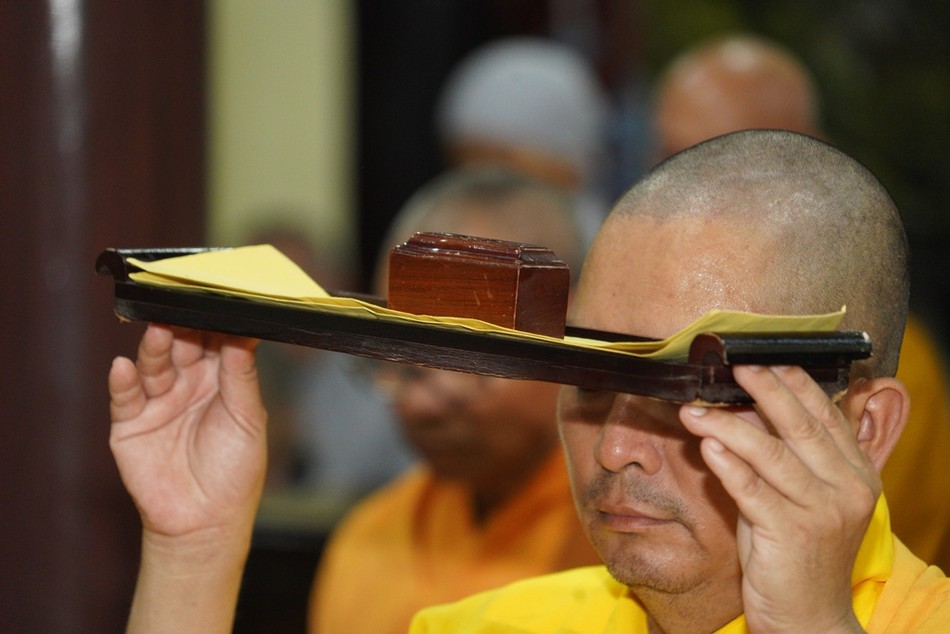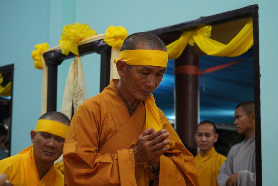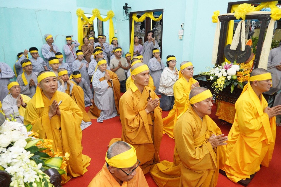 Sau lễ nhập quan, Thượng tọa Thích Như Giáo, trụ trì chùa Giác Nguyên, sám chủ lễ tang đã thực hiện nghi thức bạch Phật khai kinh, thỉnh Giác linh an vị và hướng dẫn môn đồ pháp quyến thọ tang.