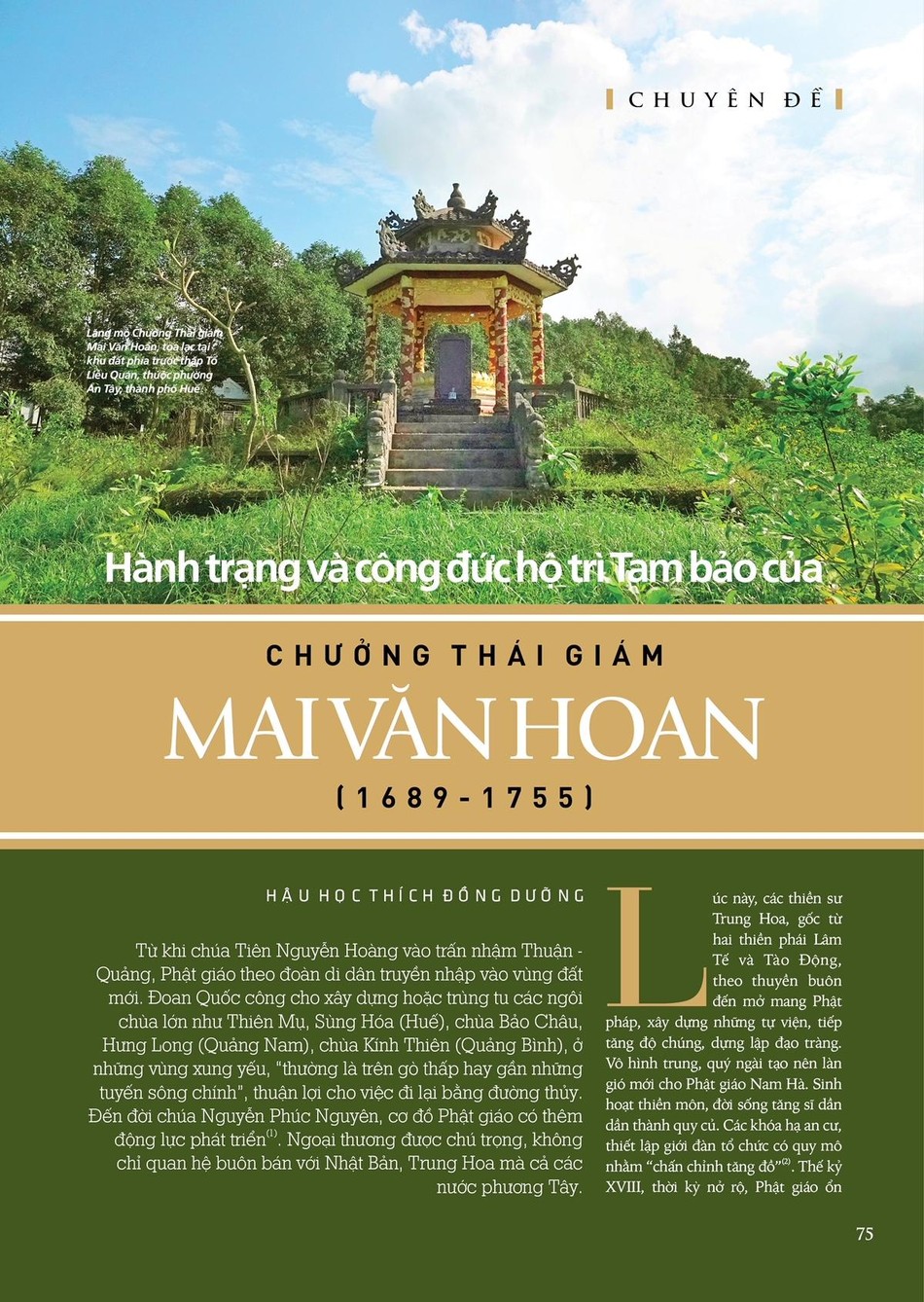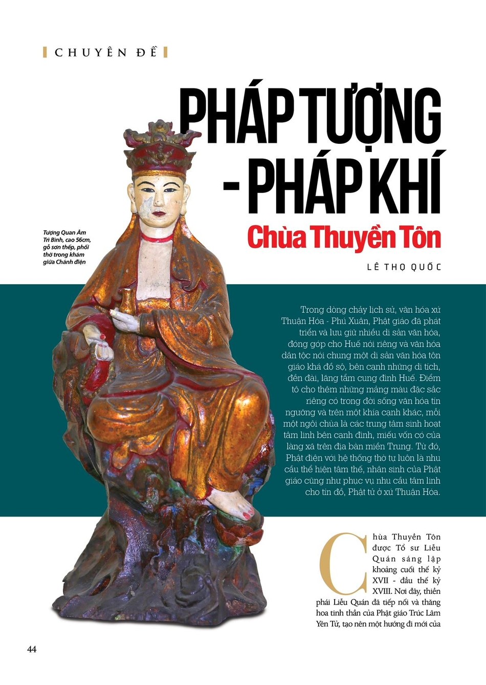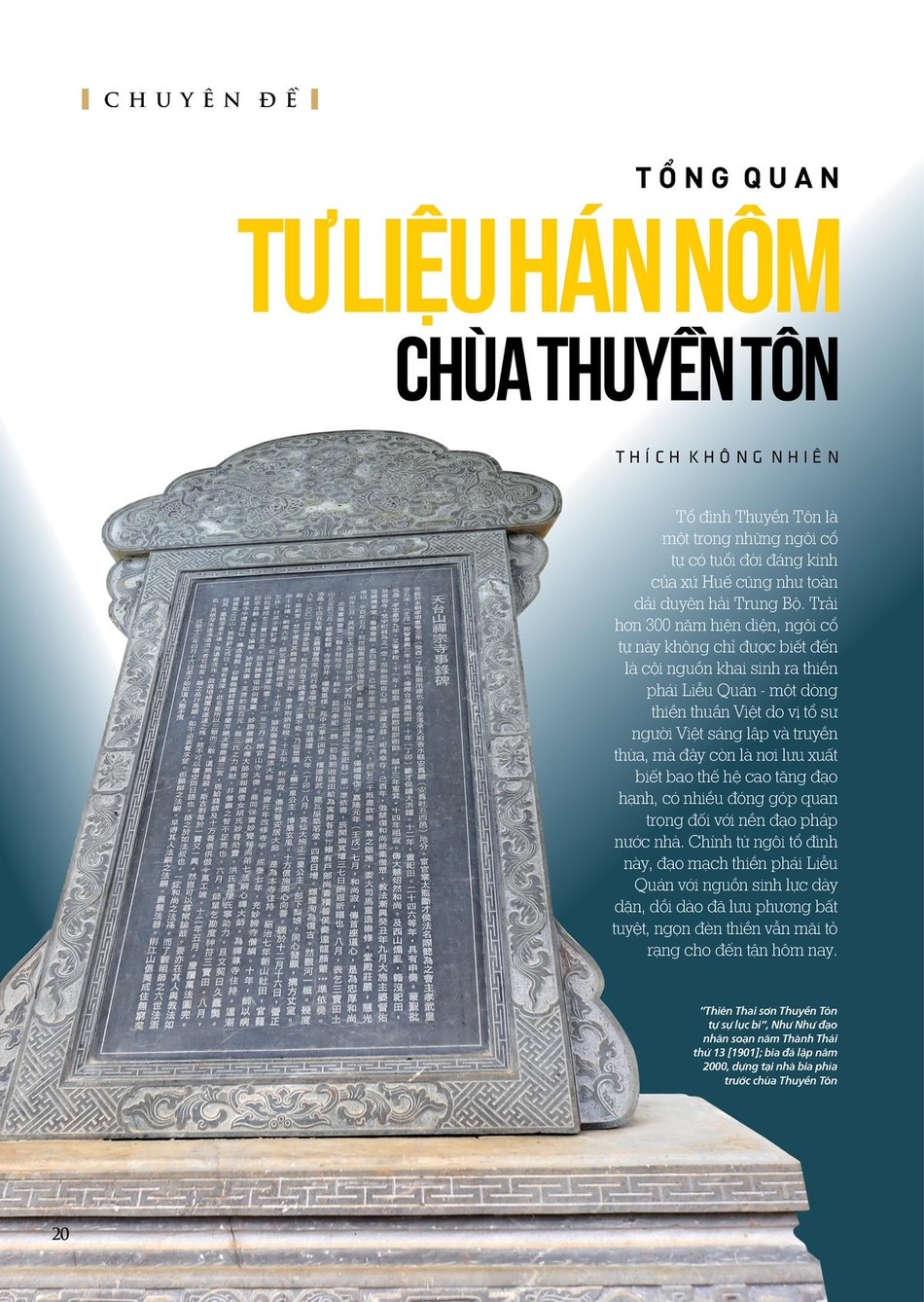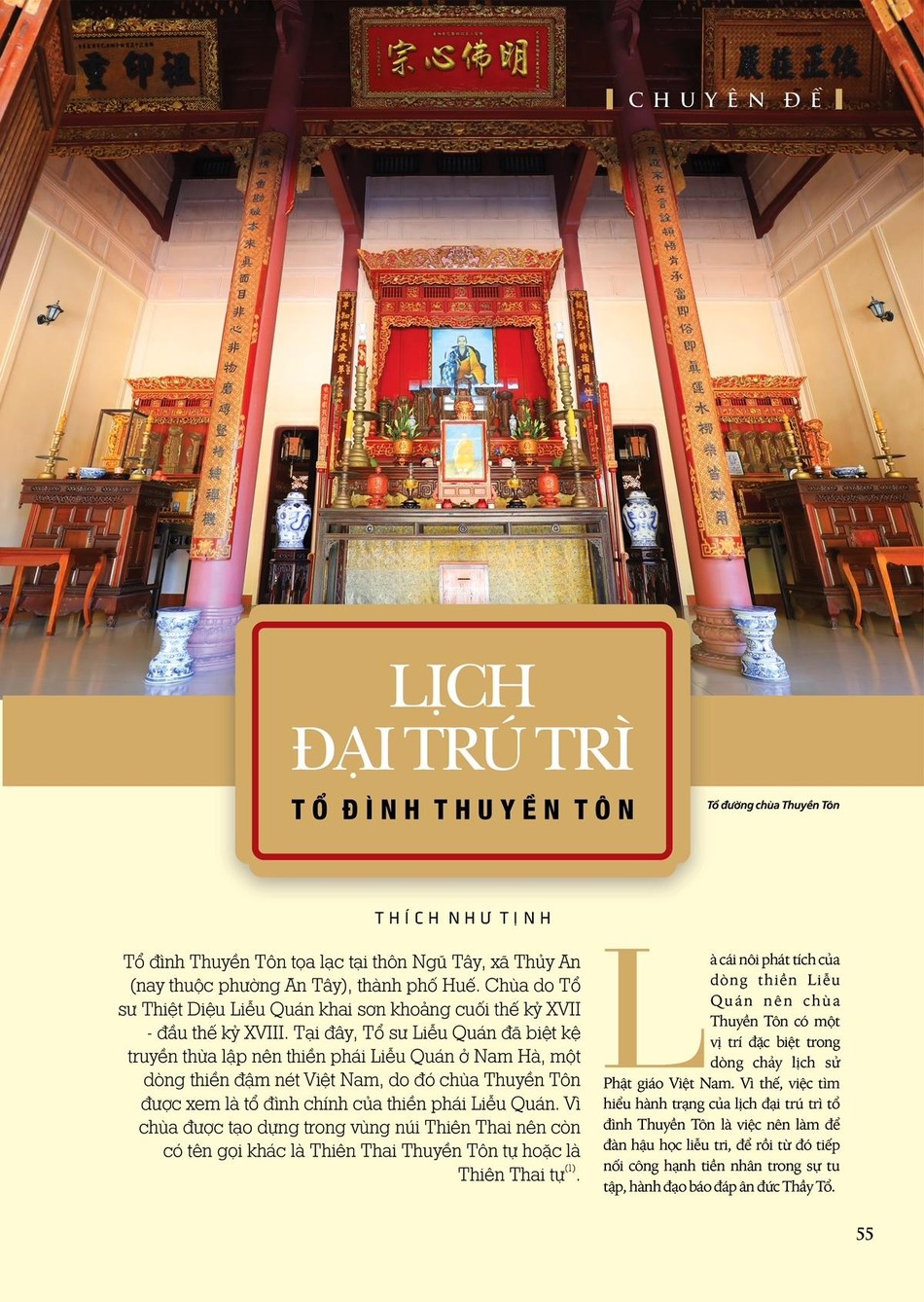 “Tổ đình Thuyền Tôn: Tự sở, truyền thừa và di sản tư liệu” - giới thiệu đến quý độc giả một trong những ngôi cổ tự có tuổi đời xưa nhất tại Huế và miền Trung, là nơi khởi nguồn của thiền phái Liễu Quán - một dòng thiền thuần Việt do Tổ sư Liễu Quán sáng lập và truyền thừa kể từ đầu thế kỷ XVIII. Chính từ ngôi tổ đình này, nguồn mạch Phật giáo đã lan tỏa đi khắp nơi, lưu xuất nhiều thế hệ cao tăng có nhiều đóng góp quan trọng đối với lịch sử Phật giáo và lịch sử dân tộc. Tại đây hiện đang lưu giữ nhiều tư liệu Phật giáo quý, với nhiều chủng loại, niên đại cổ xưa, phản ánh khá sinh động tình hình Phật giáo Thuận Hóa kể từ đầu thế kỷ XVIII đến tận hôm nay. Hy vọng chuyên đề sẽ mang đến cho quý vị những thông tin bổ ích, có giá trị”, lời ngỏ của Ban Biên soạn viết.