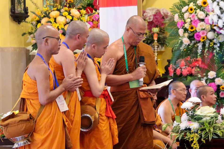 Tiếp đó, 9 giới tử thọ Tỳ-kheo lần lượt mỗi đàn 2 vị dâng hoa và đèn lên chư vị giới sư. Các giới tử cũng lần lượt được nhị vị Tuyên ngôn vấn già-nạn theo nghi thức tụng 1 lần “tuyên ngôn” và 3 lần “thành sự ngôn”, sau đó tiến lên giới đài đối trước Hội đồng Thập sư để lãnh thọ giới pháp theo nghi thức truyền thống Nam tông.