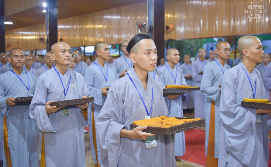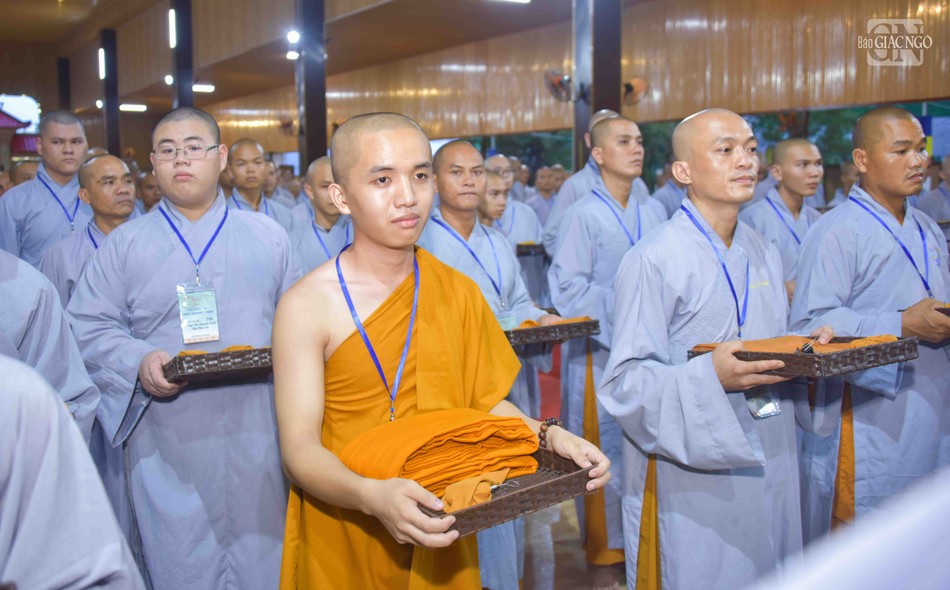 Thượng tọa Yết-ma tác pháp vấn hòa cũng như xướng tên những giới tử đủ điều kiện thọ giới Sa-di trước Đại Tăng. Sau khi Đại Tăng tác thành giới thể, Hòa thượng Yết-ma đã trao man y và đãy lọc nước cho giới tử. Thượng tọa giáo thọ hướng dẫn các tân Sa-di đảnh lễ tứ ân (Sư trưởng, cha mẹ, đất nước và đàn-na tín thí).