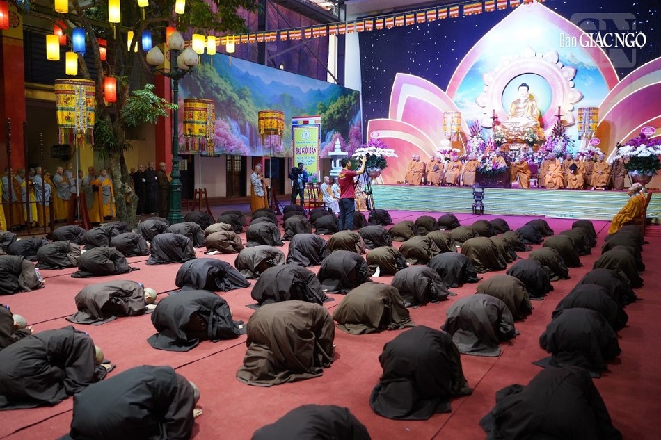 Theo đó, Ban Kiến đàn đã cung thỉnh Đức Pháp chủ GHPGVN - Trưởng lão Hoà thượng Thích Trí Quảng, Hoà thượng Đàn đầu cùng Hội đồng Thập sư Tăng, Ni quang lâm lễ đường.