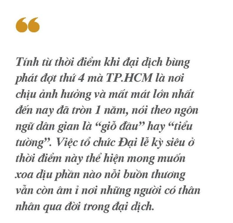 Thực sự mà nói, hiện tại thành phố nói riêng cũng như trên toàn quốc đã kiểm soát được dịch bệnh, người dân cũng đã có tiêm ngừa đầy đủ, nên tất cả phần nào rất yên tâm. Tính từ thời điểm khi đại dịch bùng phát đợt thứ 4 mà TP.HCM là nơi chịu ảnh hưởng và mất mát lớn nhất đến nay đã tròn 1 năm, nói theo ngôn ngữ dân gian là “giỗ đầu” hay “tiểu tường”. Việc tổ chức Đại lễ kỳ siêu ở thời điểm này thể hiện mong muốn xoa dịu phần nào nỗi buồn thương vẫn còn âm ỉ nơi những người có thân nhân qua đời trong đại dịch.