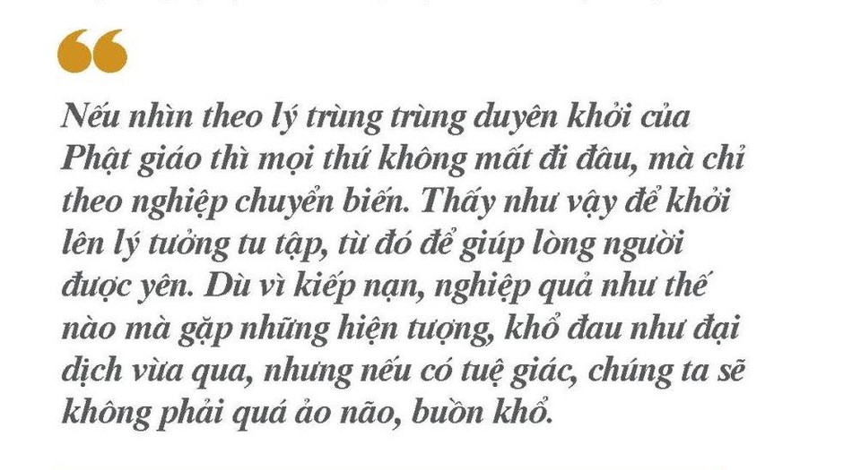 Nếu nhìn theo lý trùng trùng duyên khởi của Phật giáo thì mọi thứ không mất đi đâu, mà chỉ theo nghiệp chuyển biến. Thấy như vậy để khởi lên lý tưởng tu tập, từ đó giúp lòng người được yên. Dù vì kiếp nạn, nghiệp quả như thế nào mà gặp những hiện tượng, khổ đau như đại dịch vừa qua, nhưng nếu có tuệ giác, chúng ta sẽ không phải quá ảo não, buồn khổ. Khi mình có bình yên mới có thể giúp cho mọi người bình yên. Vua chúa, quan nhân nếu dùng tuệ giác của Phật quán chiếu để thấy được sinh diệt biến đổi chẳng qua tùy nghiệp mà luân chuyển, tự nhiên họ sẽ có bình yên. Và nếu mọi người cùng biết tu tập sẽ hiến tặng sự bình yên cho đất nước. Đó là tinh thần “Hộ quốc nhân vương”.