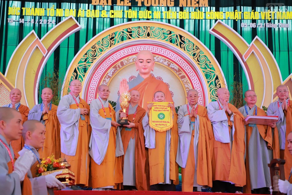 Tiếp đó, Ni trưởng Thích nữ Đàm Lan, Ủy viên Thường trực Hội đồng Trị sự, Phó Thường trực Phân ban Ni giới T.Ư công bố quyết định trao biểu tượng và cờ luân lưu đăng cai tổ chức Đại lễ tưởng niệm Đức Thánh Tổ Ni vào năm 2025 đến đơn vị Phân ban Ni giới Thủ đô Hà Nội.