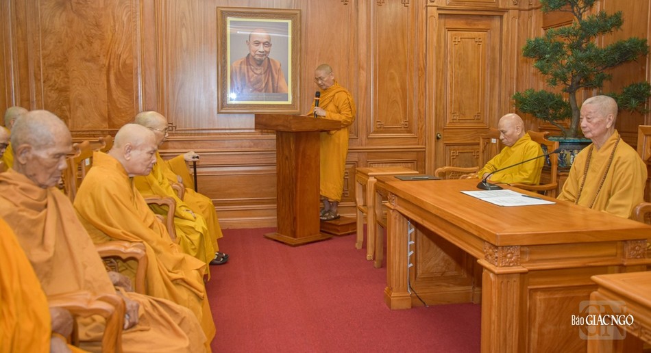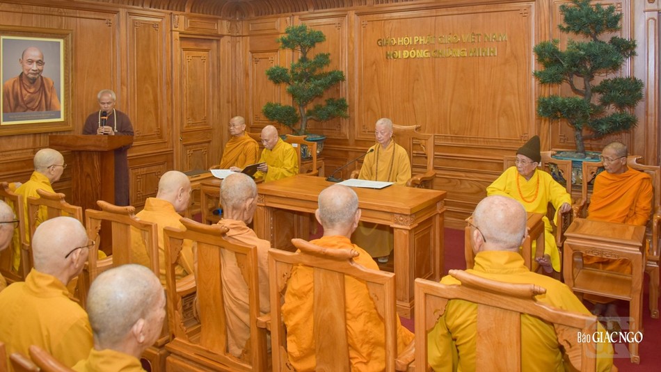 Đức Pháp chủ cũng đã chỉ định Trưởng lão Hòa thượng Thích Giác Quang, Phó Pháp chủ điều hành phần trình bày lại và lấy ý kiến biểu quyết các vấn đề đã được Ban Thường trực thảo luận, nhận định và thống nhất trong phiên họp hôm qua, 21-12-2023.