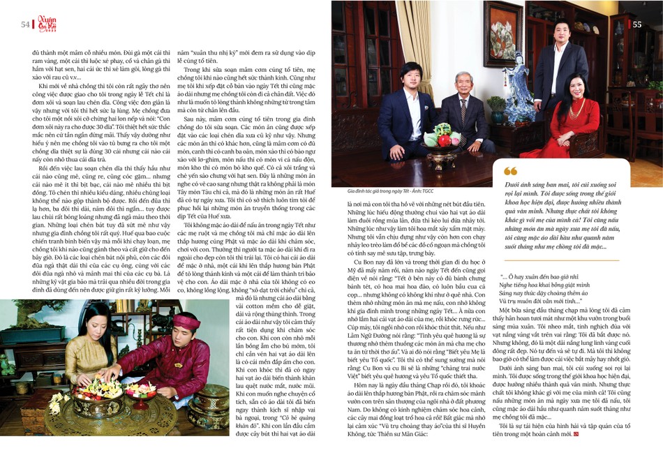 Cu Bon nay đã lớn và trong thời gian đi du học ở Mỹ đã mấy năm rồi, năm nào ngày Tết đến cũng gọi điện về nói rằng: “Tết ở bên này có đủ bánh chưng bánh tét, có hoa mai hoa đào, có luôn bầu cua cá cọp… nhưng không có không khí như ở quê nhà. Con thèm nhớ những món ăn mà mẹ nấu, con nhớ không khí gia đình mình trong những ngày Tết… À nữa con nhớ lắm hai cái vạt áo dài của mẹ, rồi khóc rưng rức... Cúp máy, tôi ngồi nhớ con rồi khóc thút thít.