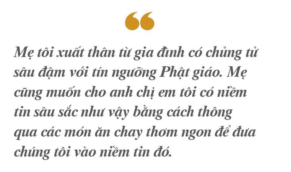 Như thường lệ mọi năm, vào ngày mồng một Tết, sau khi cả nhà đi xuất hành lên chùa về, ai nấy đều cảm thấy đói và mệt. Tết là dịp duy nhất để anh chị em tôi được phép mặc đồ đẹp suốt ngày, mẹ tôi cũng thế. Tôi không quên được hình ảnh mẹ tôi quấn hai vạt áo dài lên, lăng xăng chuẩn bị bữa cơm cho cả nhà. Mẹ tôi xuất thân từ gia đình có chủng tử sâu đậm với tín ngưỡng Phật giáo. Mẹ cũng muốn cho anh chị em tôi có niềm tin sâu sắc như vậy bằng cách thông qua các món ăn chay thơm ngon để đưa chúng tôi vào niềm tin đó.