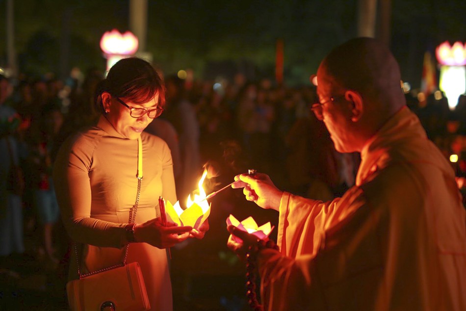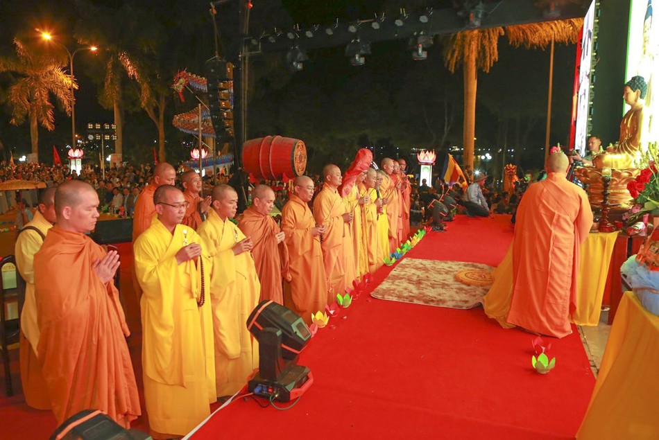 Tiếp đến là nghi thức truyền đăng do Hòa thượng Thích Châu Quang khởi điểm - đón nhận ngọn nến từ bàn Phật sau đó truyền trao đến chư tôn đức và toàn thể hội chúng. Những ngọn nến ấy mang thông điệp của tình yêu thương, lòng từ bi lan tỏa khắp nơi nơi, mang những điều nguyện cầu tốt đẹp cho toàn nhân loại.