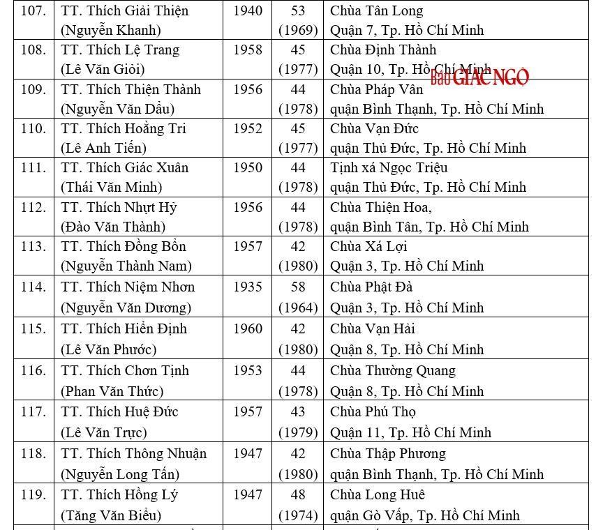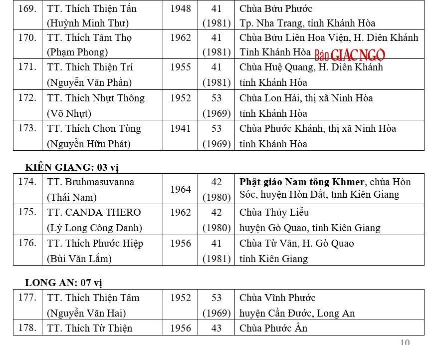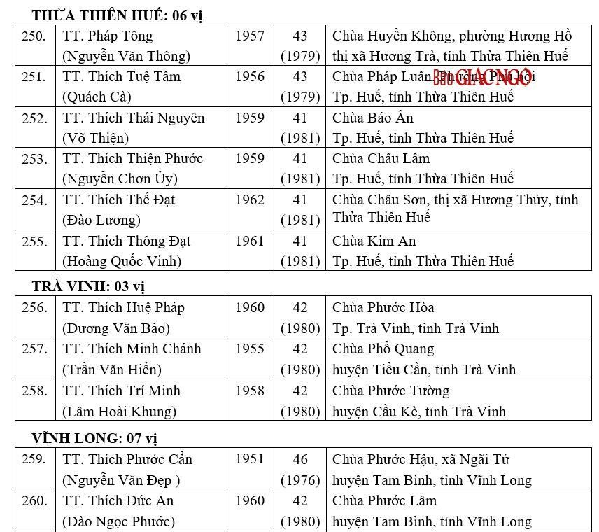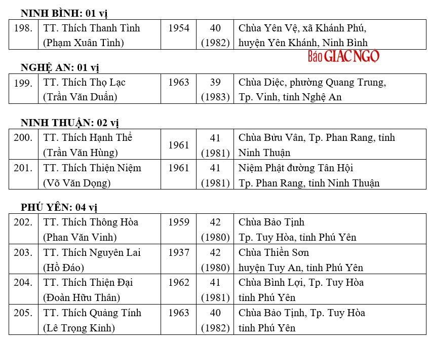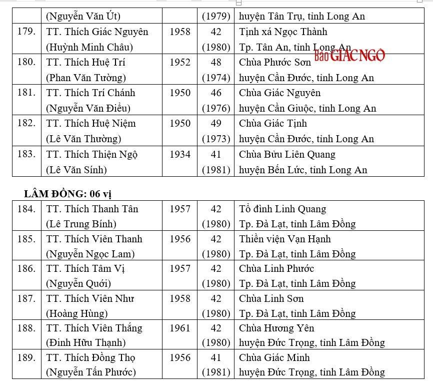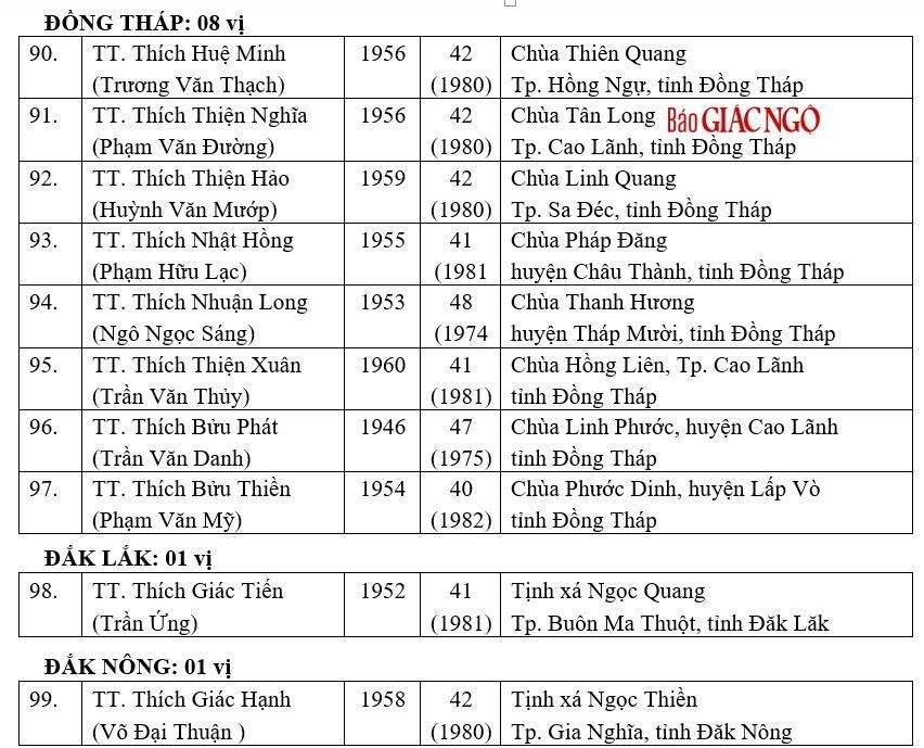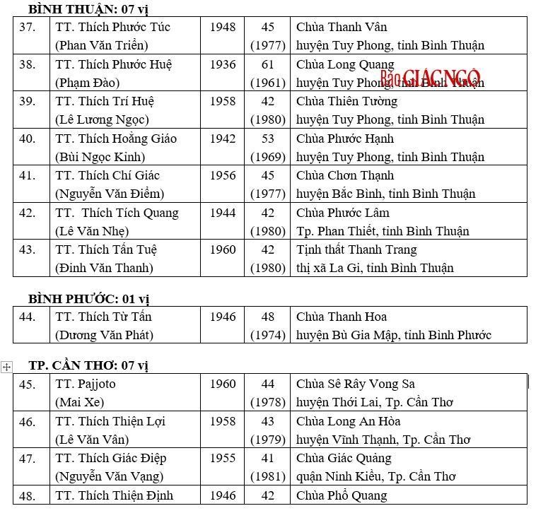 Chân dung Trưởng ban và danh sách Phó Thường trực, Chánh Thư ký Ban Trị sự GHPGVN 15 tỉnh thành mới phía Nam