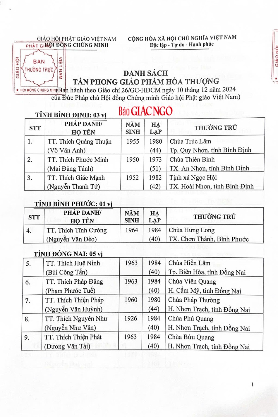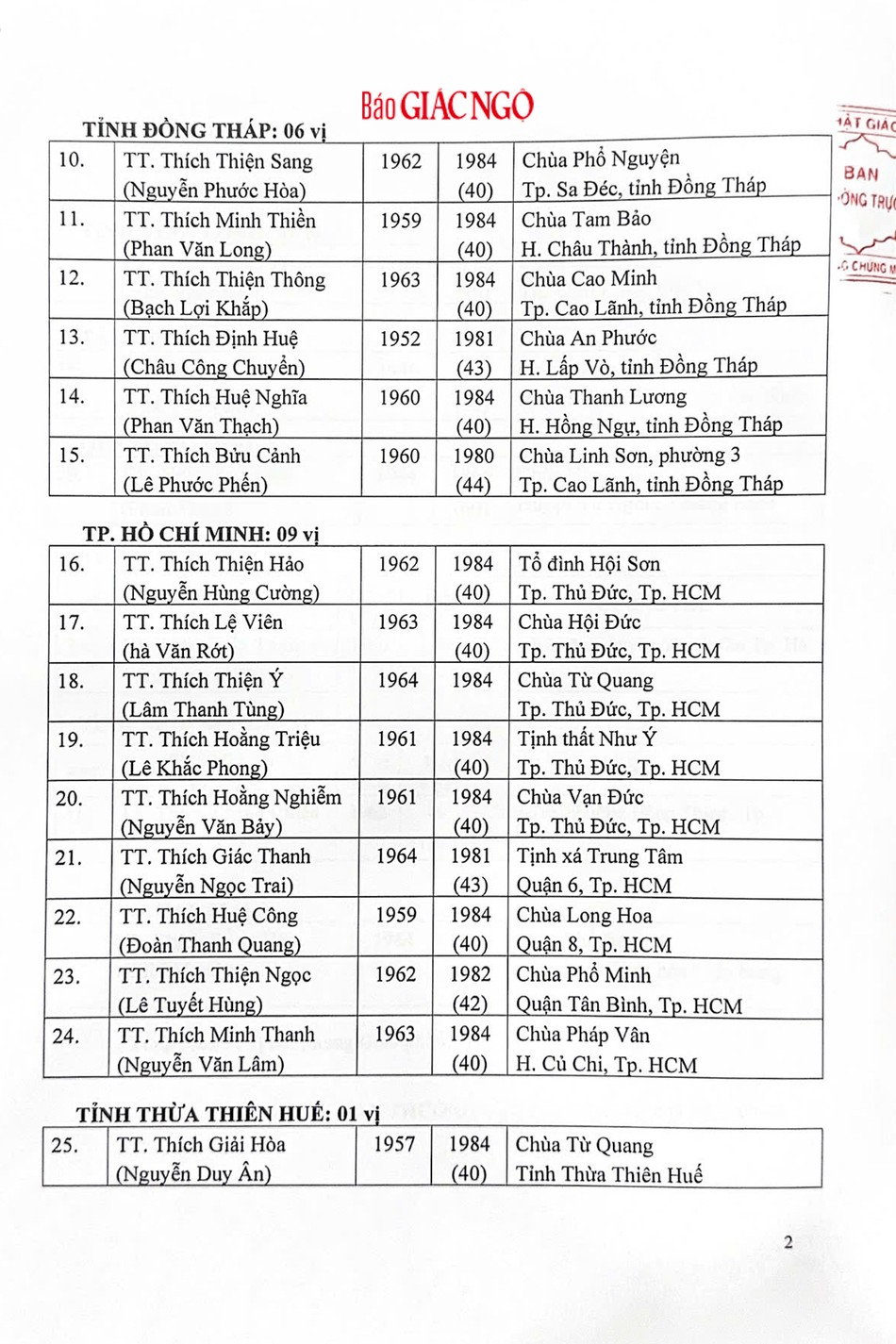 Cụ thể, tỉnh Bình Định có 3 vị, tỉnh Đồng Nai 5 vị, tỉnh Đồng Tháp 6 vị, TP.HCM 9 vị; TP.Huế, Hà Nội và các tỉnh Bình Phước, Trà Vinh, Vĩnh Long, Tây Ninh, Ninh Bình, Quảng Ngãi, mỗi địa phương có 1 vị; Cộng hòa Liên bang Đức có 1 vị.