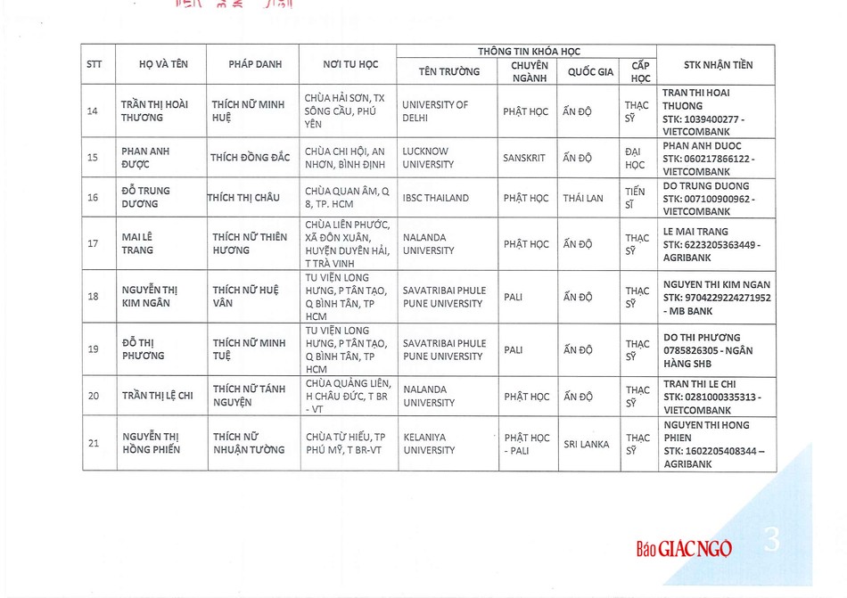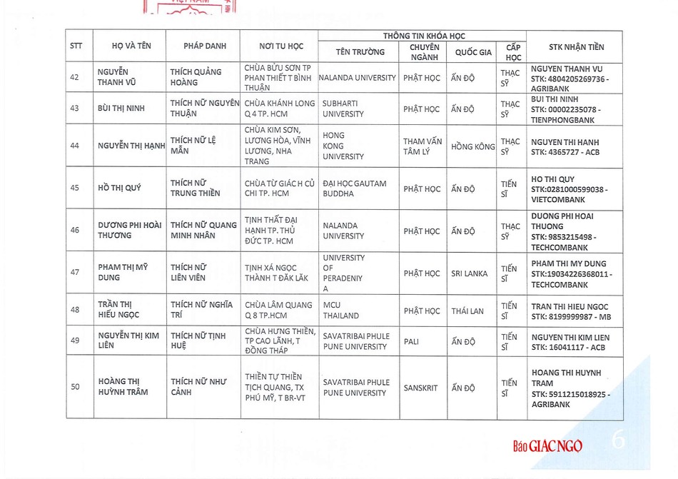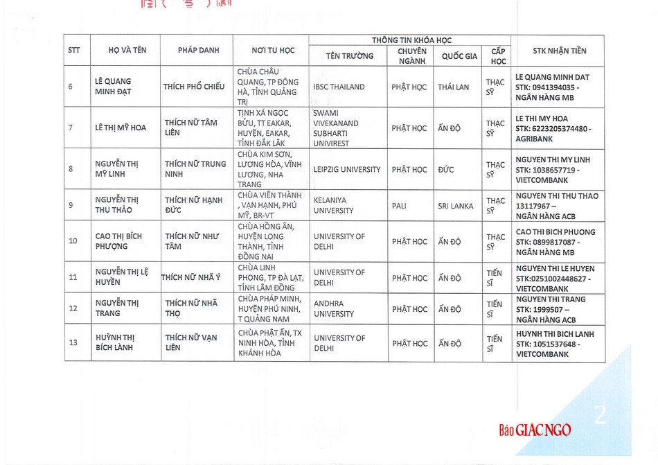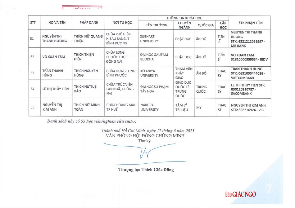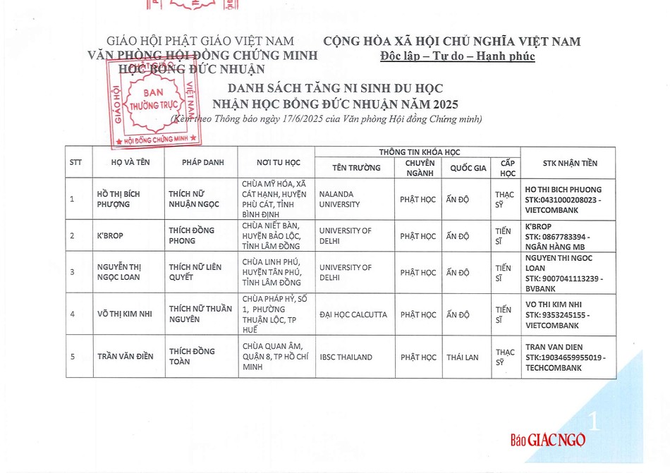 GNO - Hôm nay, 17-6, Thông tin từ Văn phòng Hội đồng Chứng minh, phụng hành huấn thị của Đức Pháp chủ và chư tôn Trưởng lão Ban Thường trực Hội đồng Chứng minh, Thượng tọa Thích Giác Dũng, Thư ký Văn phòng đã có thông báo danh sách các Tăng Ni sinh du học được nhận học bổng Đức Nhuận năm 2025.