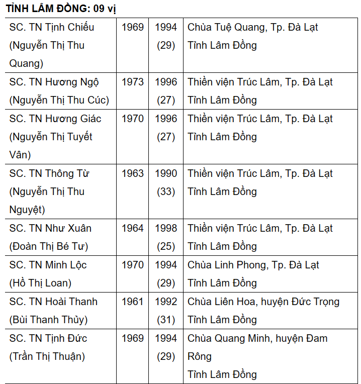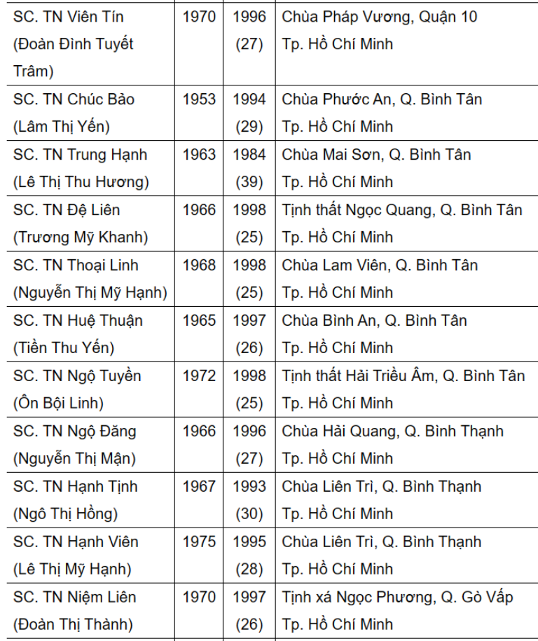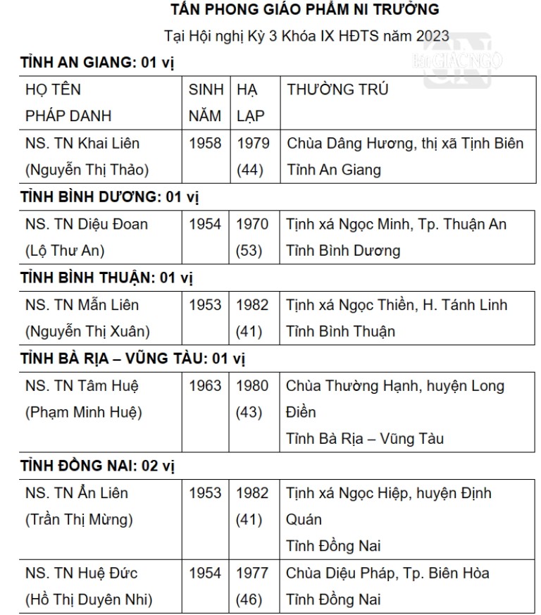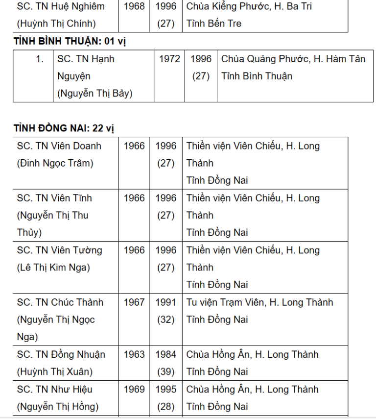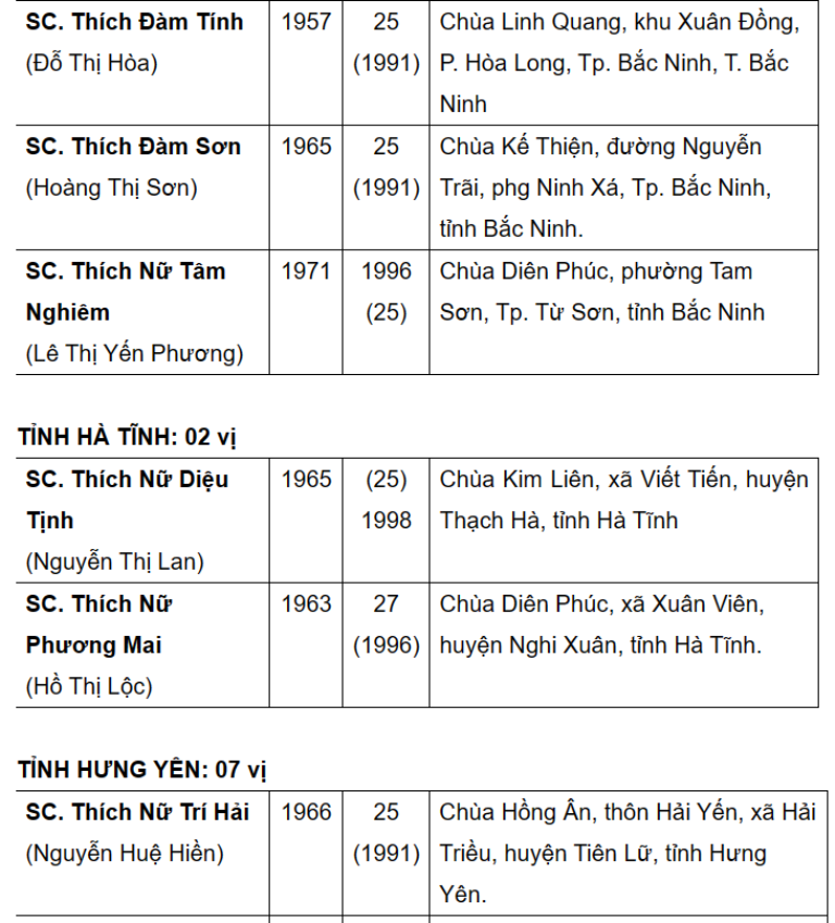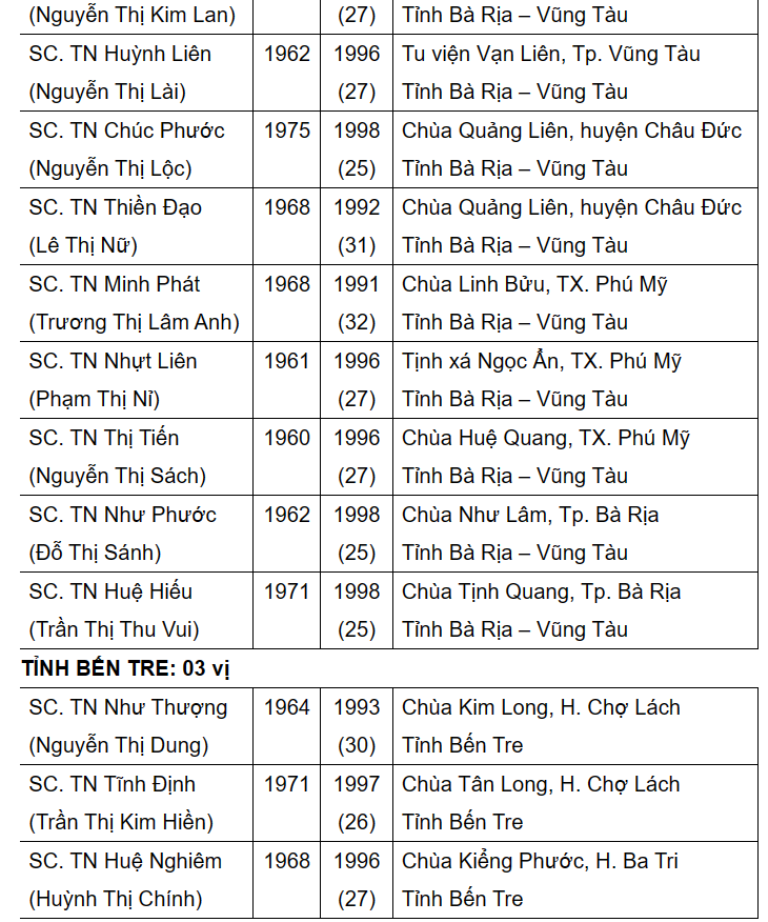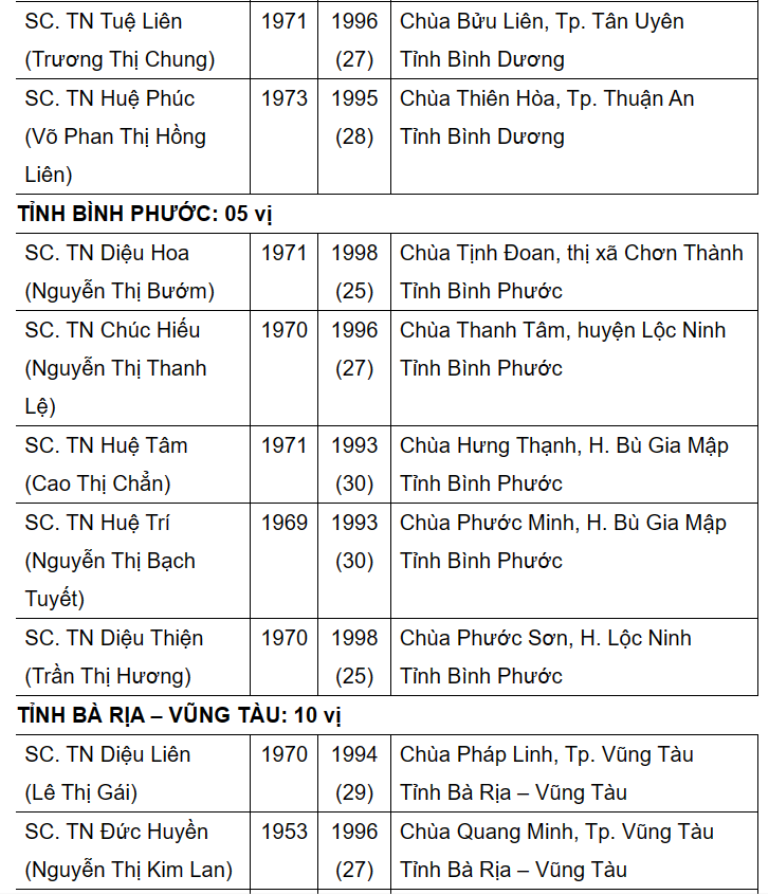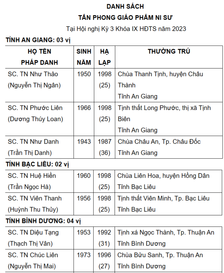 Danh sách đệ trình tấn phong giáo phẩm Ni trưởng, Ni sư tại Hội nghị Thường niên kỳ 3 - Khóa IX