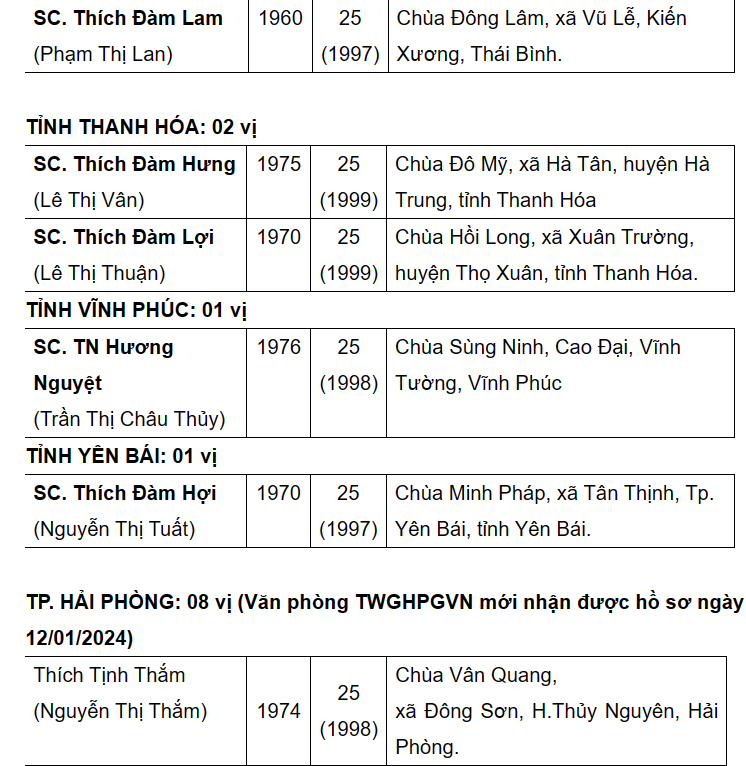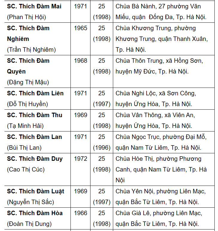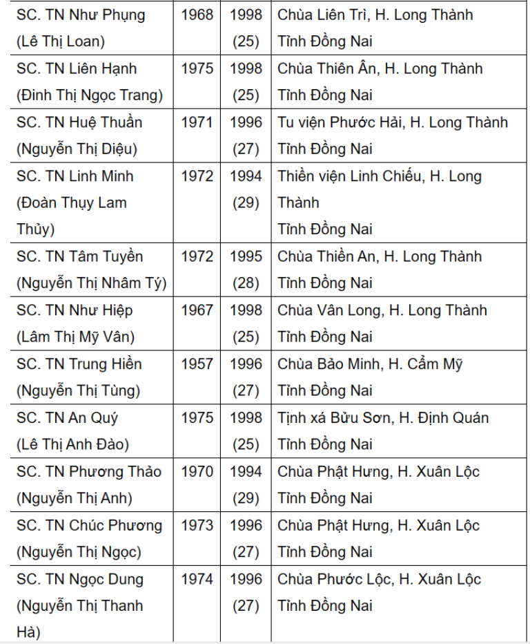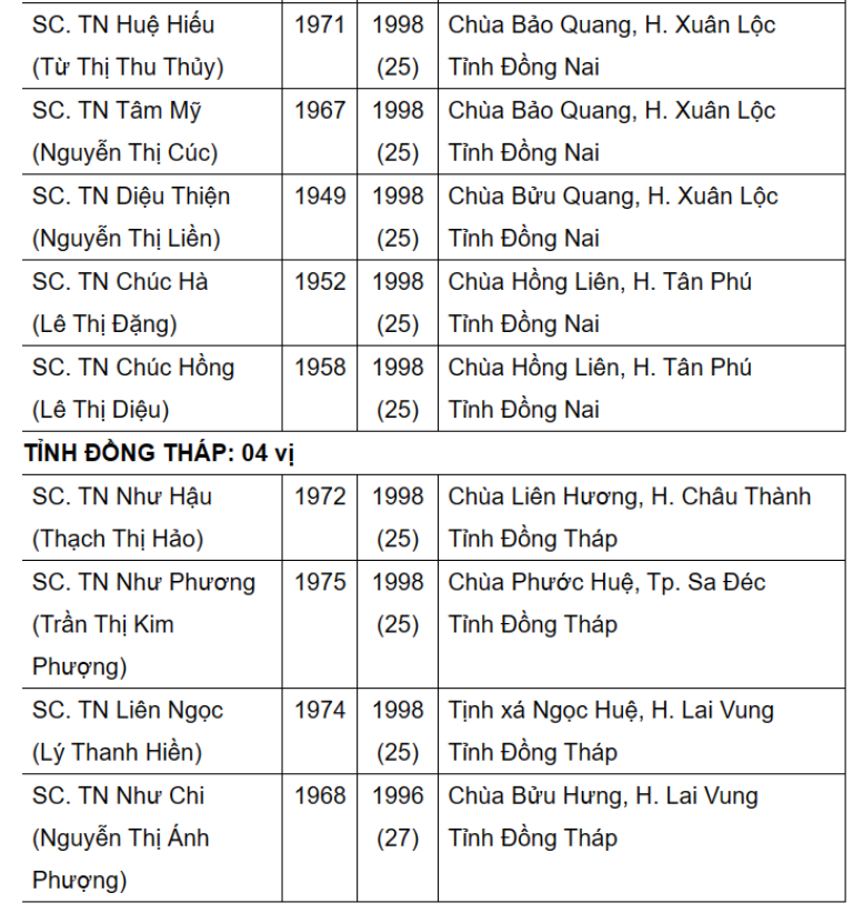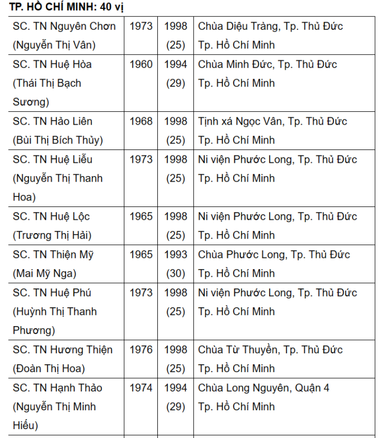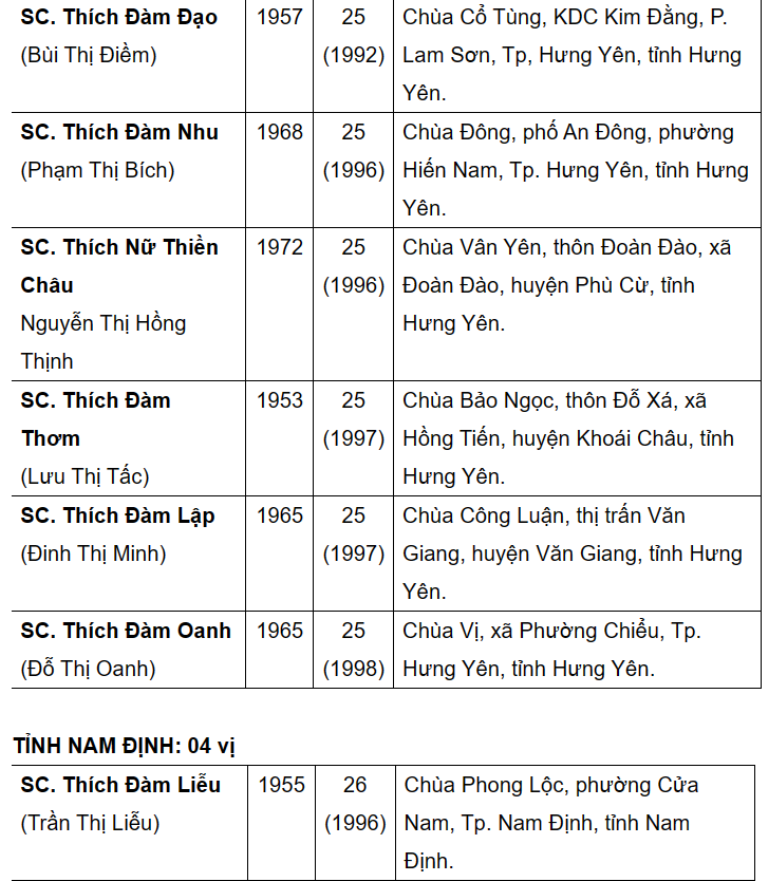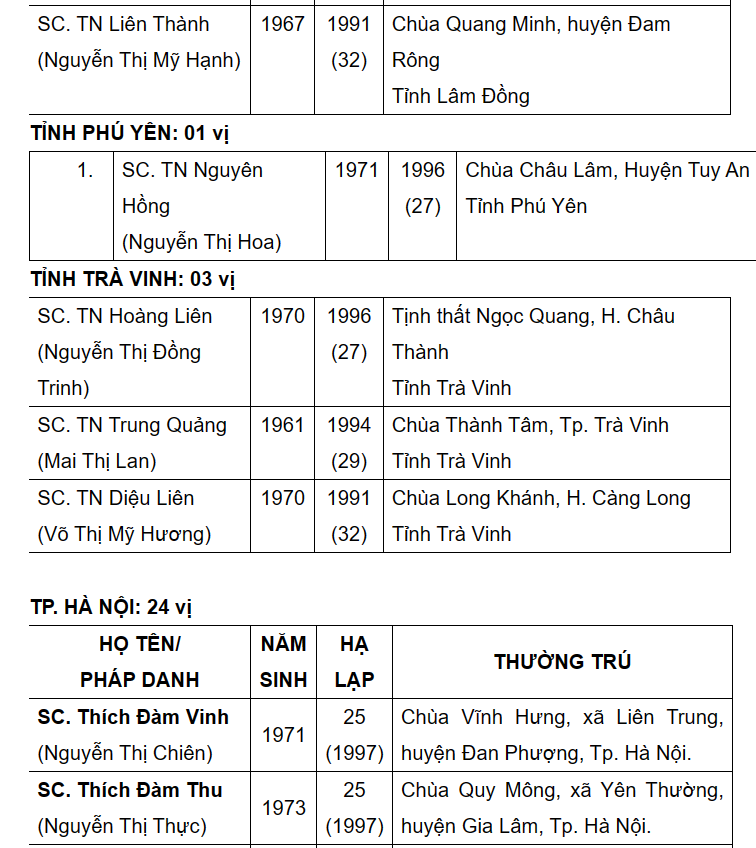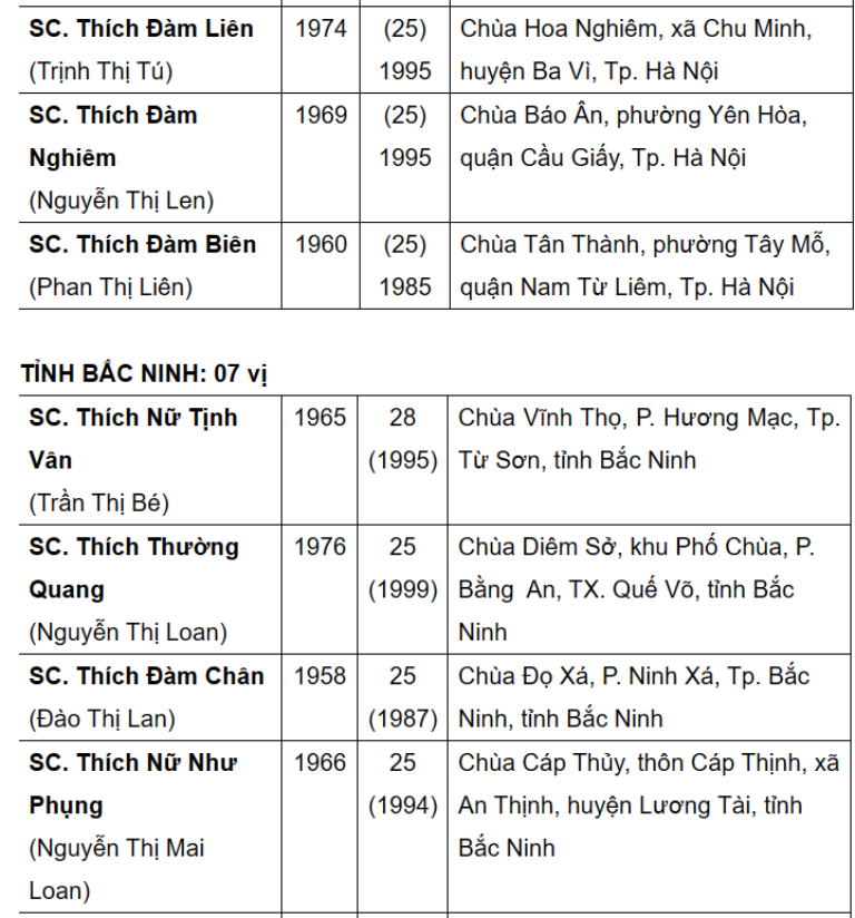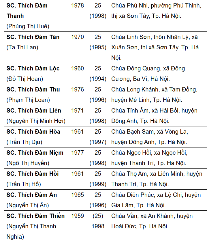 Danh sách đệ trình tấn phong giáo phẩm Ni trưởng, Ni sư tại Hội nghị Thường niên kỳ 3 - Khóa IX