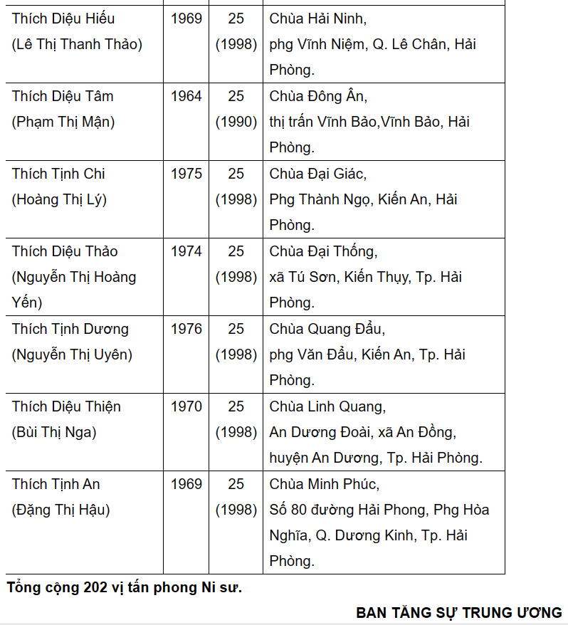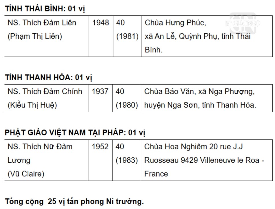 GNO - Ngày 15-1, tại Hội nghị Thường niên kỳ 3 - Khóa IX GHPGVN thông qua danh sách tấn phong giáo phẩm gồm: 25 vị Ni sư lên giáo phẩm Ni trưởng, 202 vị Sư cô được tấn phong giáo phẩm Ni sư. Danh sách này sẽ được đệ trình Hội đồng Chứng minh xem xét và ban hành Giáo chỉ chính thức sau đó.
