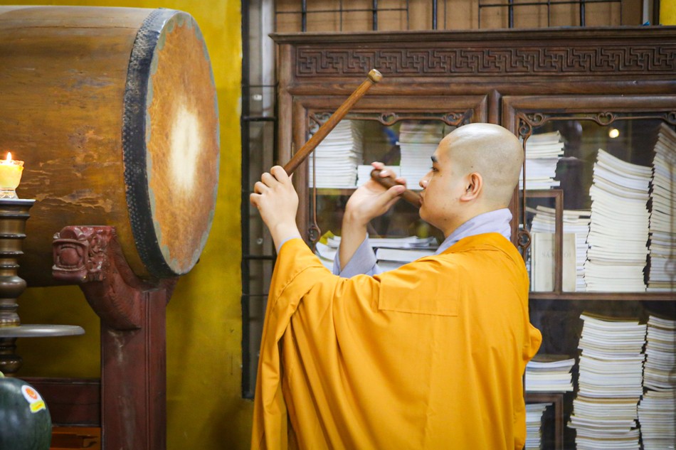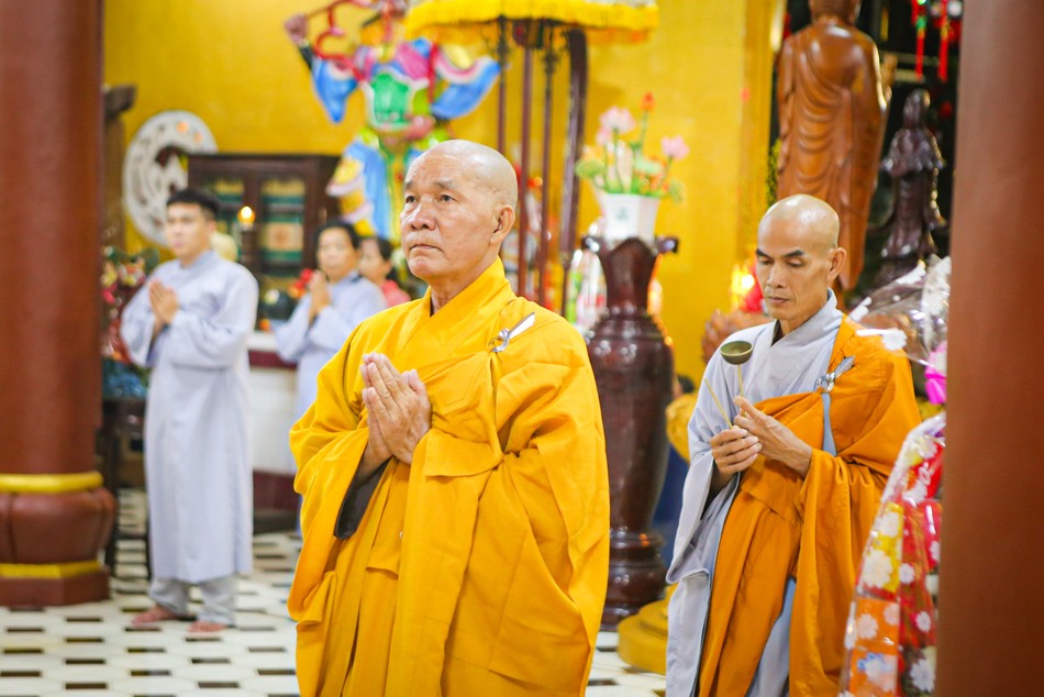 Tại buổi lễ, Thượng tọa Thích Tịnh Tâm, trụ trì chùa Hoằng Linh cùng Tăng chúng đã niêm hương, đảnh lễ Tam bảo, cầu nguyện chư Phật gia hộ và thực hiện nghi thức khai chung bảng.