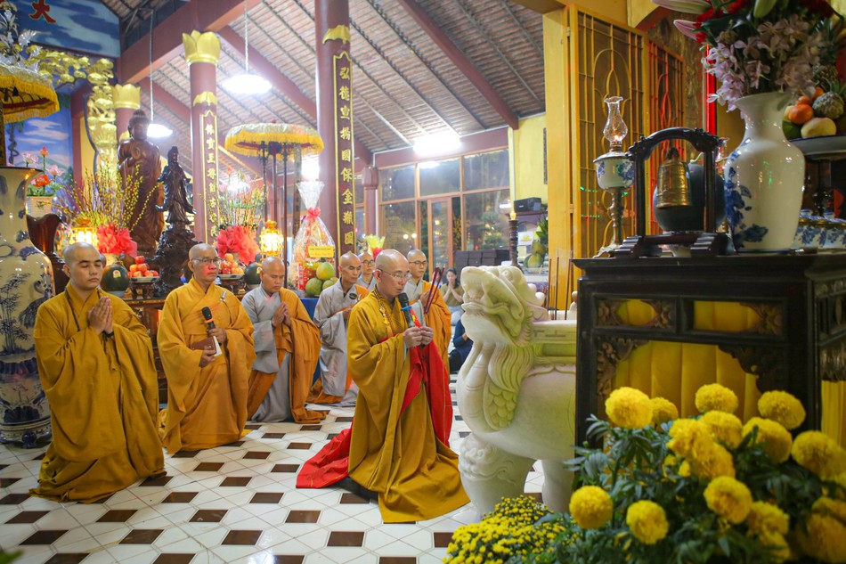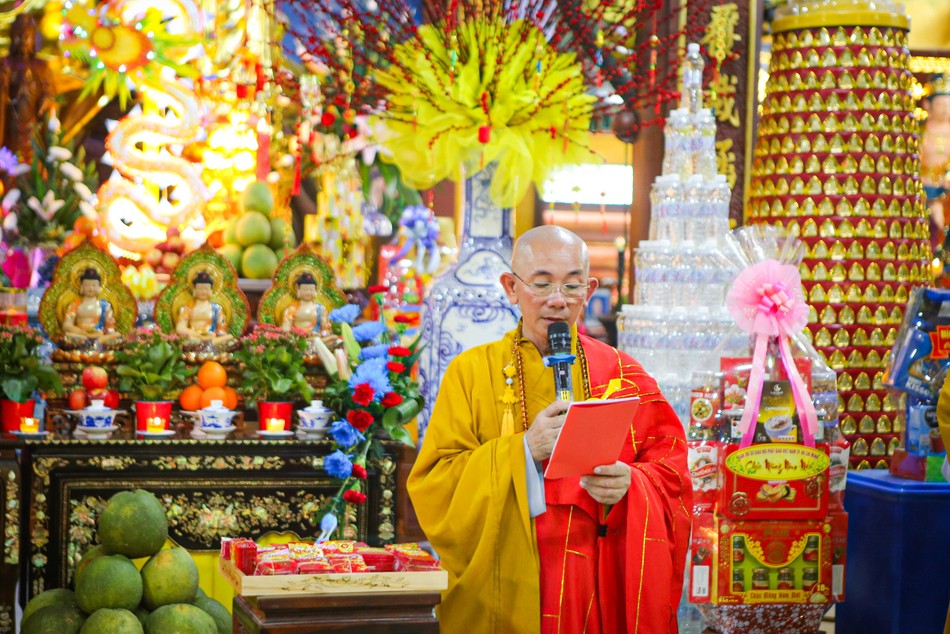 Dịp này, Thượng tọa trụ trì cũng có lời chúc Tết và trao lộc xuân đến các Phật tử đến chùa lễ Phật trong thời khắc chuyển giao giữa năm cũ và năm mới.