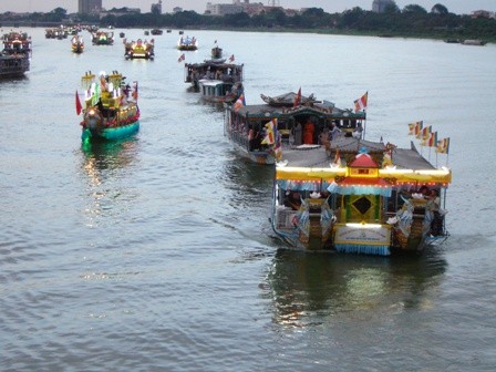 Thuyền hoa của các đơn vị được trang trí theo nhiều chủ đề về cuộc đời Đức Phật. Từ nhiều ngày trước, các đơn vị đã lo thiết trí thuyền hoa và tập kết về bến Bia Quốc Học để chuẩn bị cho lễ khai mạc vào lúc 18 giờ, sau đó là nghi thức diễu hành. Trong tiếng chuông trống Bát nhã ngân vang, hòa trong sự mầu nhiệm của sông Hương mùa Phật đản, 50 chiếc thuyền hoa đã nối đuôi nhau diễu hành từ bến Bia Quốc Học, thẳng lên chùa Thiên Mụ, quay về Đập Đá và tập kết vòng tròn trước bến Nghinh Lương Đình để phóng hoa đăng.