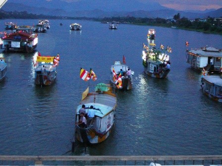 Hàng nghìn chiếc hoa đăng đã được thả xuống dòng sông, ánh nến lung linh huyền nhiệm mang theo những thông điệp của người con Phật về hạnh phúc, an lạc.