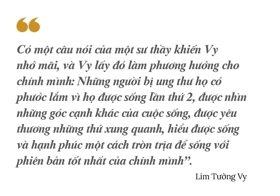 Có người chỉ cảm nhận những cơn đau của ung thư, còn những người như Tường Vy nhờ đó mà thực sự bắt đầu sống. Ung thư giúp Vy hiểu sâu sắc hơn về việc mình đang sống thông qua cái chết.