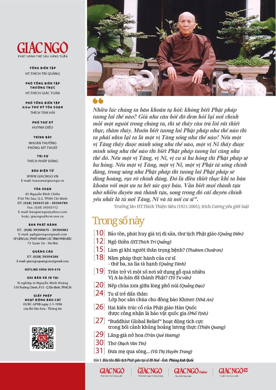 - Trong mục Tư vấn, chia sẻ cùng bạn đọc vấn đề: "Trăn trở vì một số nơi sử dụng gỗ quá nhiều"; "Vị A-la-hán đã thành Phật?".