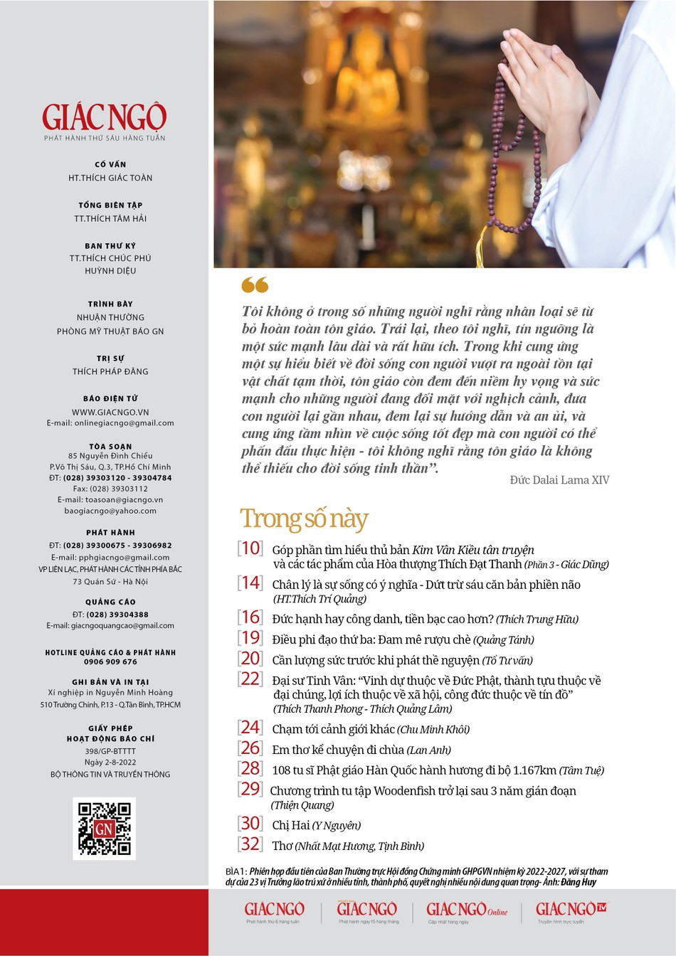 - Trên mục Điểm nhìn: Giới thiệu cùng bạn đọc bài "Góp phần tìm hiểu thủ bản Kim Vân Kiều tân truyện và các tác phẩm của Hòa thượng Thích Đạt Thanh" do Thượng tọa Thích Giác Dũng biên khảo, trong nỗ lực viết lại tiểu sử của bậc danh tăng Phật giáo miền Nam một cách trung thực với những gì thuộc về ngài.