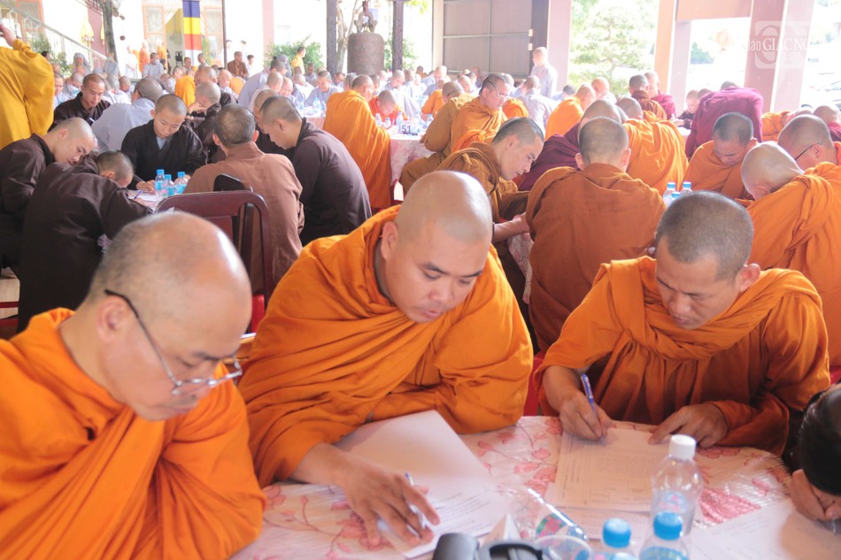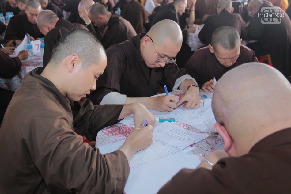 2.037 giới tử chính thức bắt đầu kỳ thi. Mỗi giới tử phải hoàn thành bài thi trắc nghiệm với 40 câu hỏi và phần thi viết luận với tổng thời gian là 150 phút. Nội dung thi bao gồm các kiến thức cơ bản trong Phật học Phổ thông (quyển 1, 2, 3, 4), giới luật, Hiến chương GHPGVN và Quy chế Ban Tăng sự T.Ư.