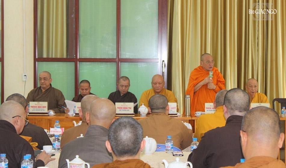Đại đức Thích Thiện Trí, Phó Thư ký kiêm Chánh Văn phòng Ban Trị sự Phật giáo tỉnh báo cáo tóm tắt công tác trần thiết treo cờ, băng-rôn, banner tại cầu An Hảo - Hòa Hiệp - Bửu Hòa; 16 tiểu ban đã hoàn thành các nội dung, đặc biệt có chương trình thuyết pháp, văn nghệ, buffet chay.