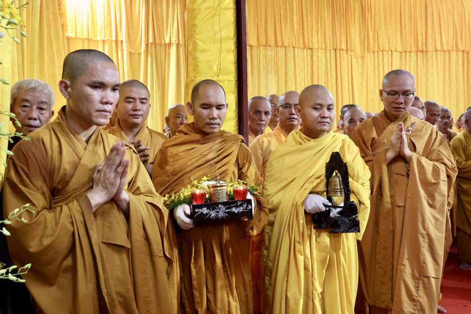 Tại buổi lễ, chư tôn giáo phẩm đã dâng hương bạch Phật, thực hiện nghi thức trị quan, sái tịnh đàn tràng. Trong tiếng niệm Phật trầm hùng của đại chúng, môn đồ pháp quyến đã thành kính cung thỉnh nhục thân Trưởng lão Hòa thượng đến Giác linh đường nhập kim quan.