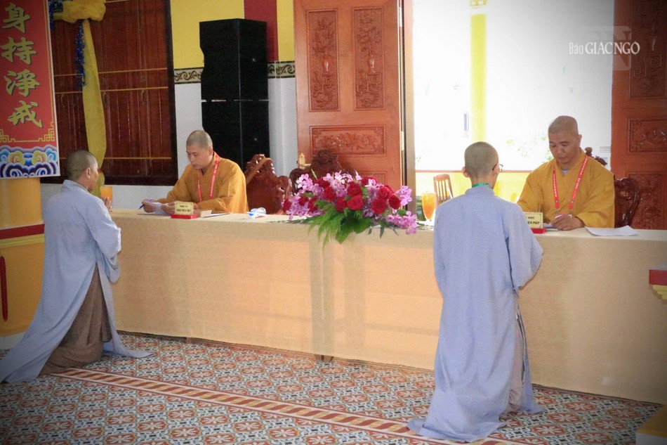 Sau lễ cung thỉnh giới bổn, các giới tử đã tham dự kỳ thi trắc nghiệm và khảo hạch với nội dung giáo lý Phật học Phổ thông. Kỳ thi được tổ chức nghiêm túc nhằm giúp các giới tử ôn tập, tăng trưởng kiến thức nội điển và ngoại điển.