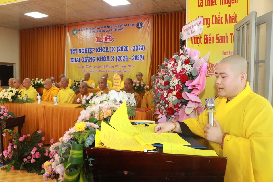 Phát biểu khai mạc, Đại đức Thích Minh Nhã, Hiệu phó Học vụ đã nêu lên tầm quan trọng, lợi ích thiết thực của công tác giáo dục Phật giáo trong ngôi nhà chung của GHPGVN và cho biết, Trường Trung cấp Phật học tỉnh Đồng Tháp luôn đề cao việc chuyên cần và thái độ học tập của Tăng Ni sinh, đặc biệt là tuân thủ quy luật thiền môn, sự tôn kính các bậc trưởng thượng, thầy tổ và nếp sống lục hòa nội trú theo truyền thống. Do đó, bên cạnh trau dồi kiến thức Phật học, nhà trường luôn chú trọng đến nếp sống phạm hạnh giới đức, tăng trưởng tâm đức và phát triển tuệ đức của các Tăng Ni sinh, hướng đến lý tưởng hoằng pháp, sứ mệnh trụ trì và tinh thần phụng sự nhân sinh.