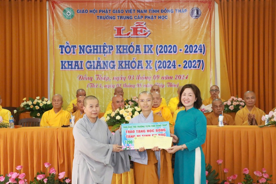 Dịp này, Ban Bảo trợ Trường Trung cấp Phật học tỉnh Đồng Tháp đã ra mắt và trao tặng 2 học bổng, mỗi phần trị giá 1.200 USD cho Tăng Ni sinh du học và trao tặng 70 thẻ Bảo hiểm y tế đến Tăng Ni sinh khóa X.