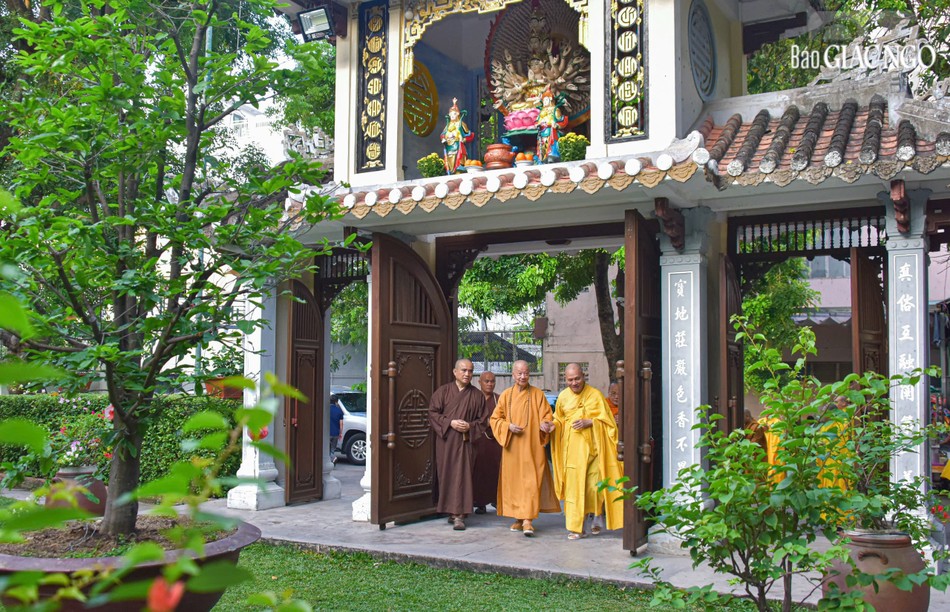 Tháp tùng Đức Pháp chủ có chư tôn đức trong Văn phòng Đức Pháp chủ, Hội đồng Điều hành Học viện Phật giáo VN tại TP.HCM. Hòa thượng Thích Nguyên Giác, trụ trì Quảng Hương Già Lam cùng chư Tăng trú xứ vân tập cung đón Đức Pháp chủ GHPGVN.