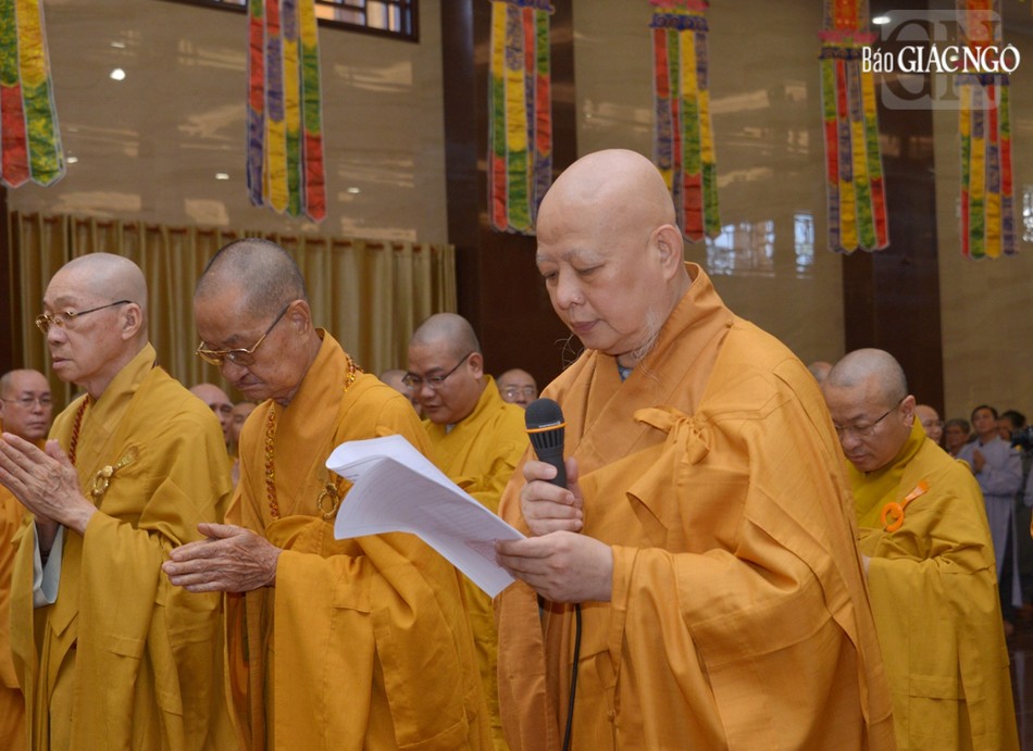 | Hòa thượng Thích Lệ Trang cùng chư tôn đức Ban Trị sự Phật giáo TP.HCM cầu thỉnh Đức Pháp chủ có lời khai thị đến Pháp hội |