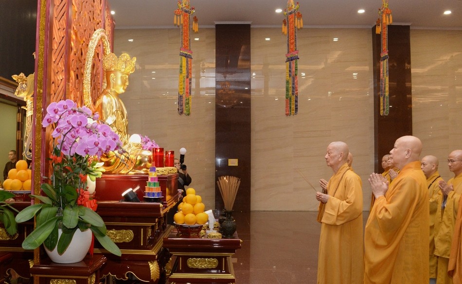 Tại chánh điện Việt Nam Quốc Tự, trước Phật đài trang nghiêm, Đức Pháp chủ đã niêm hương bạch Phật, đảnh lễ Tam bảo.