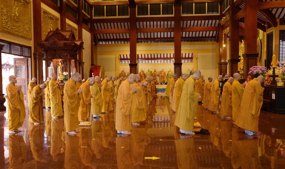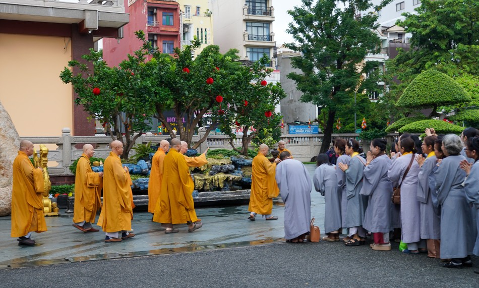 Đức Pháp chủ GHPGVN - Đại lão Hòa thượng Thích Trí Quảng tác pháp Tự tứ cùng chư Tăng tại Việt Nam Quốc Tự - Ảnh: Nguyện Truyền/BGN