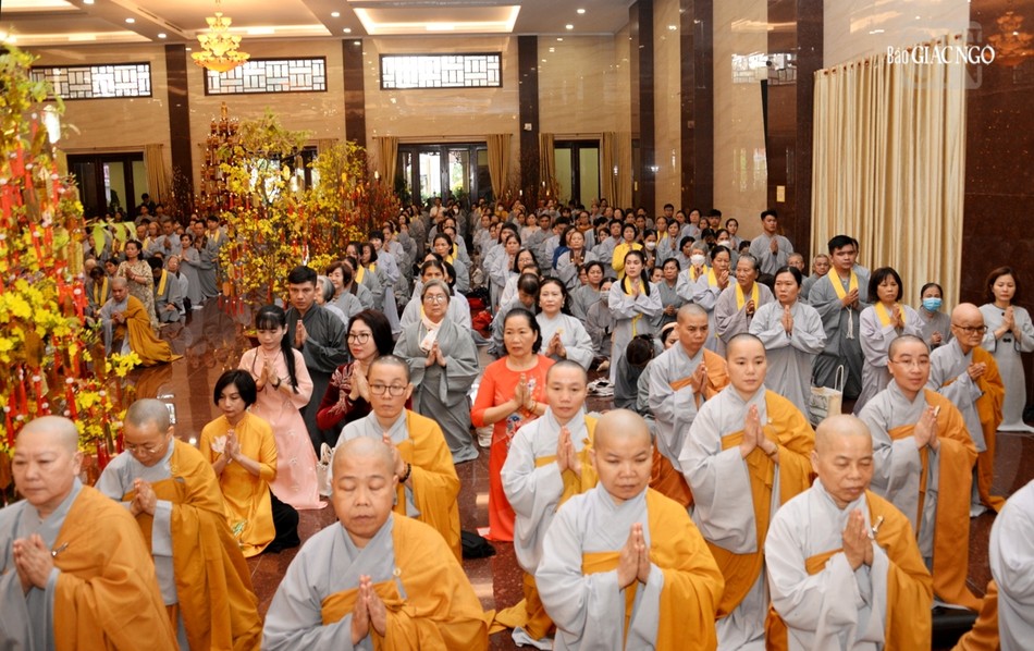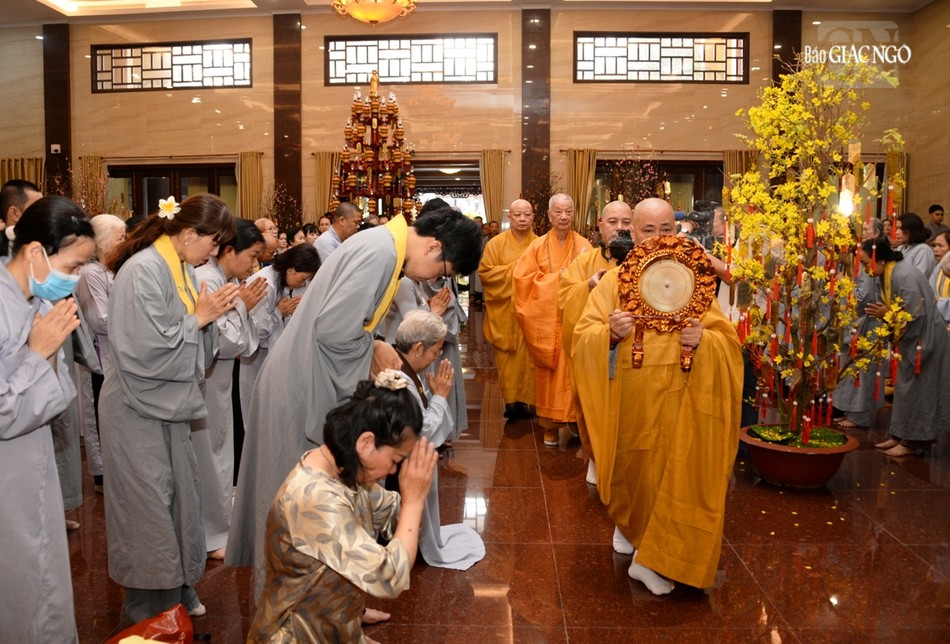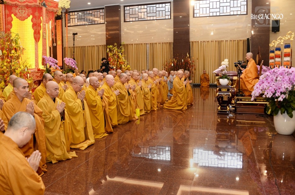 Đối trước Đức Pháp chủ GHPGVN, đại diện toàn thể Tăng Ni thuộc Ban Trị sự GHPGVN TP.HCM, các ban chuyên môn, Ban Trị sự TP.Thủ Đức, 21 quận huyện, Hòa thượng Thích Lệ Trang, Phó Chủ tịch Hội đồng Trị sự, Trưởng ban Nghi lễ T.Ư, Trưởng ban Trị sự Phật giáo TP.HCM đại diện dâng lời khánh tuế Đức Pháp chủ GHPGVN, Chứng minh Đạo sư Phật giáo TP.HCM.